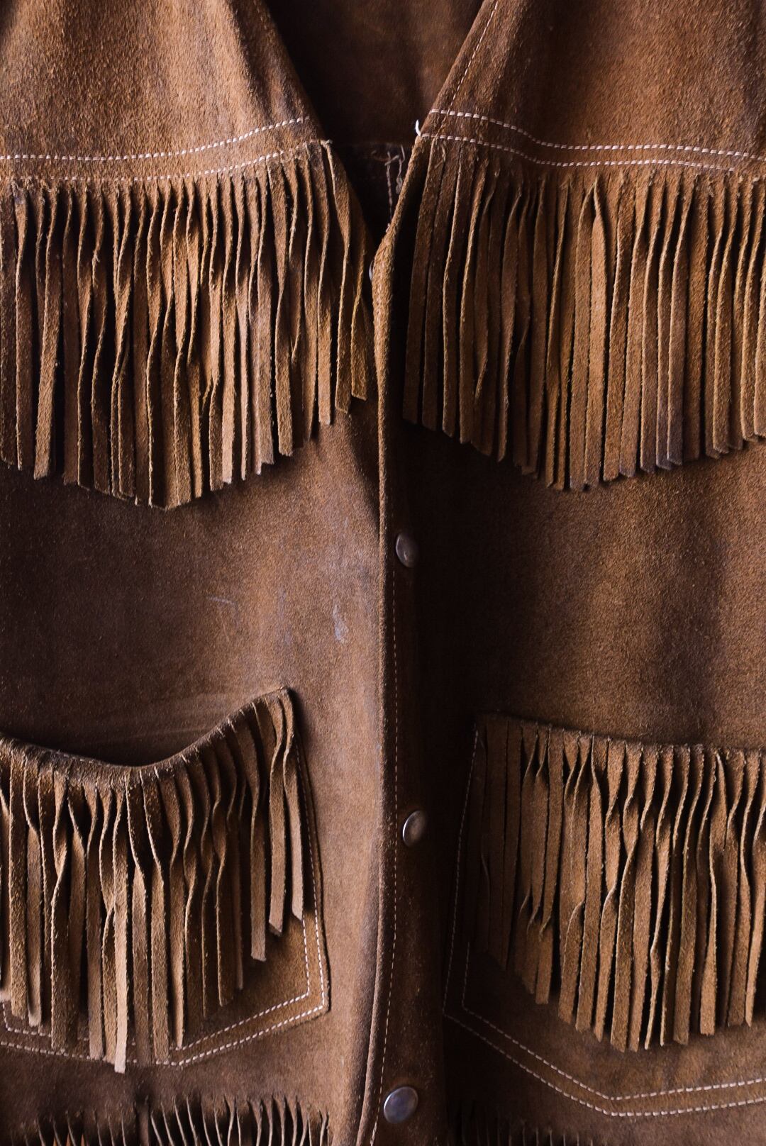 胸元・ポケット・裾に施された大胆なフリンジが動きに合わせて揺れ、70sヒッピーやウエスタンスタイルを想起させる一着。