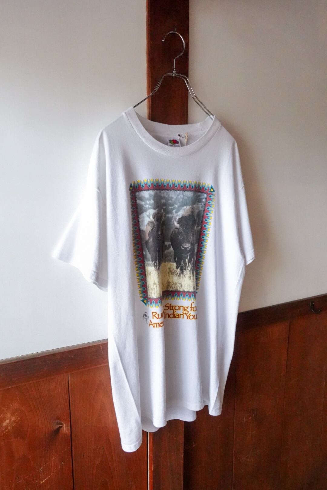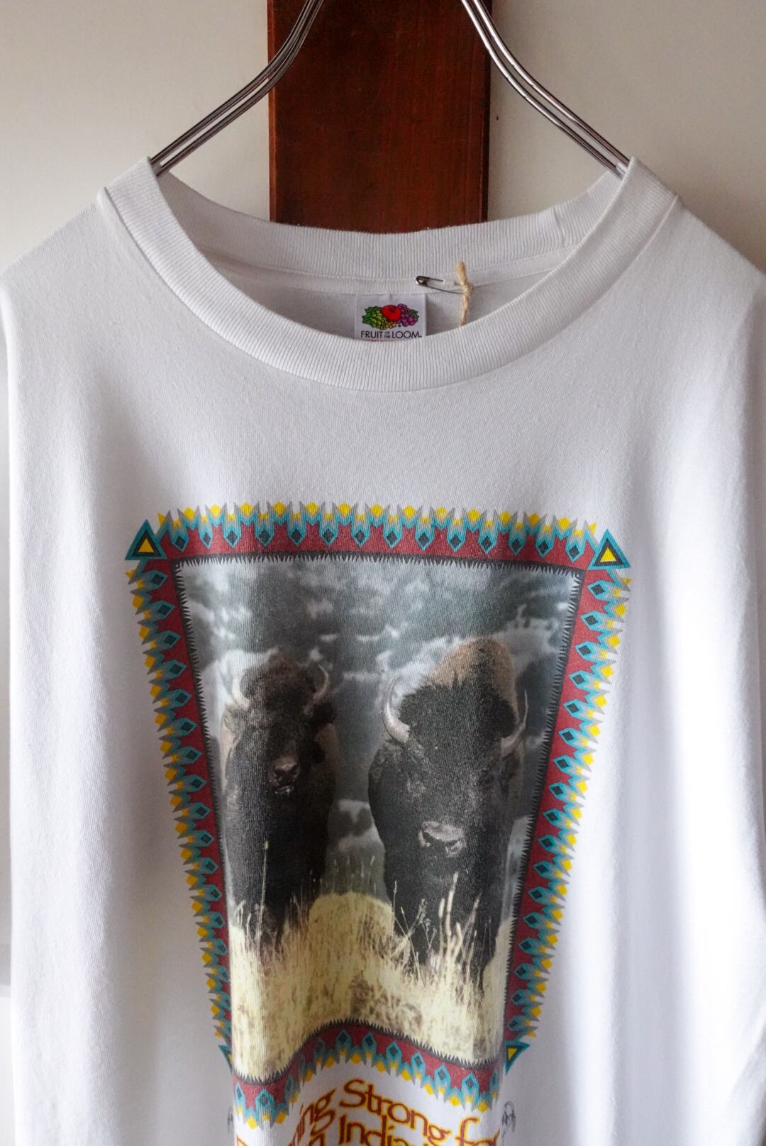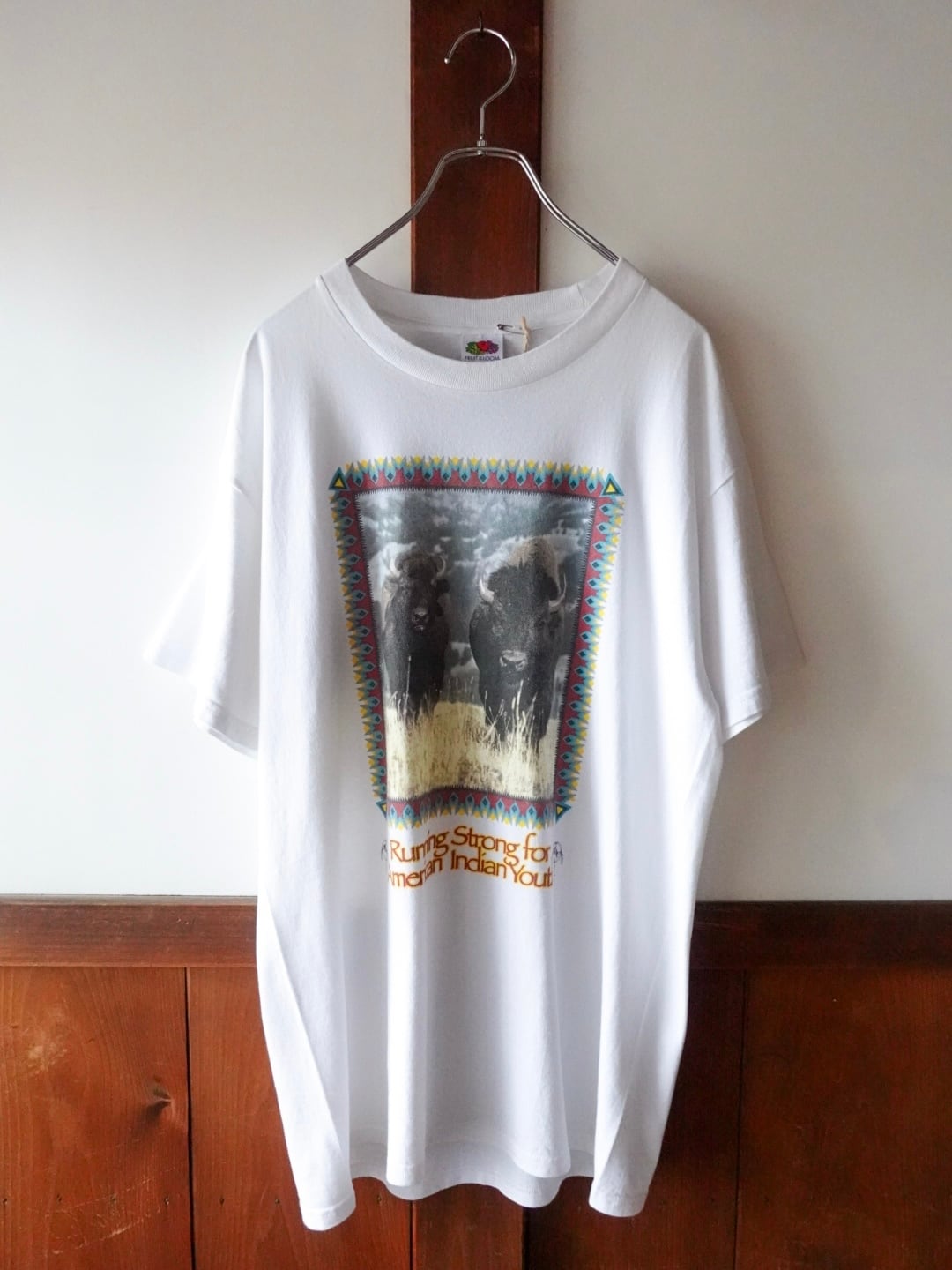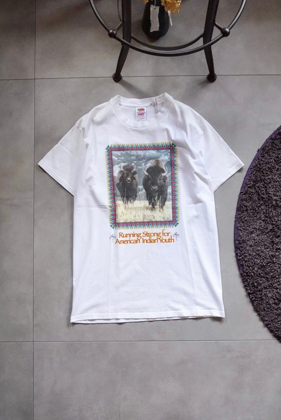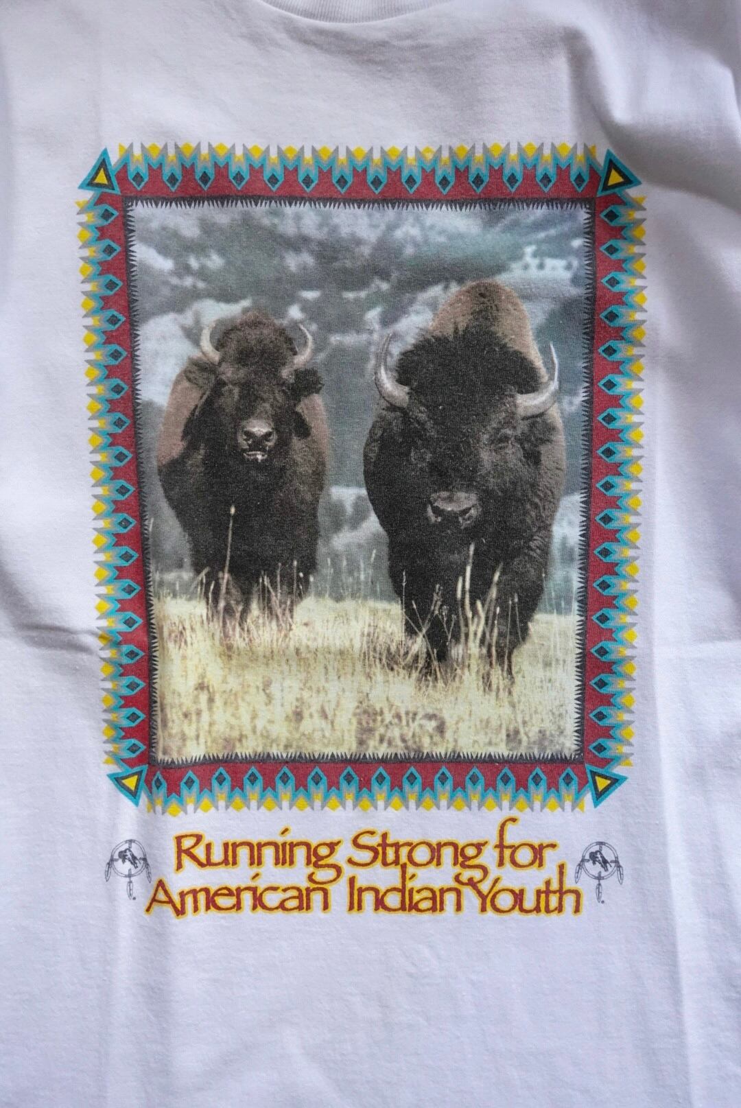 大地を駆けるバイソンと、ネイティブモチーフの枠組みが印象的な一枚。