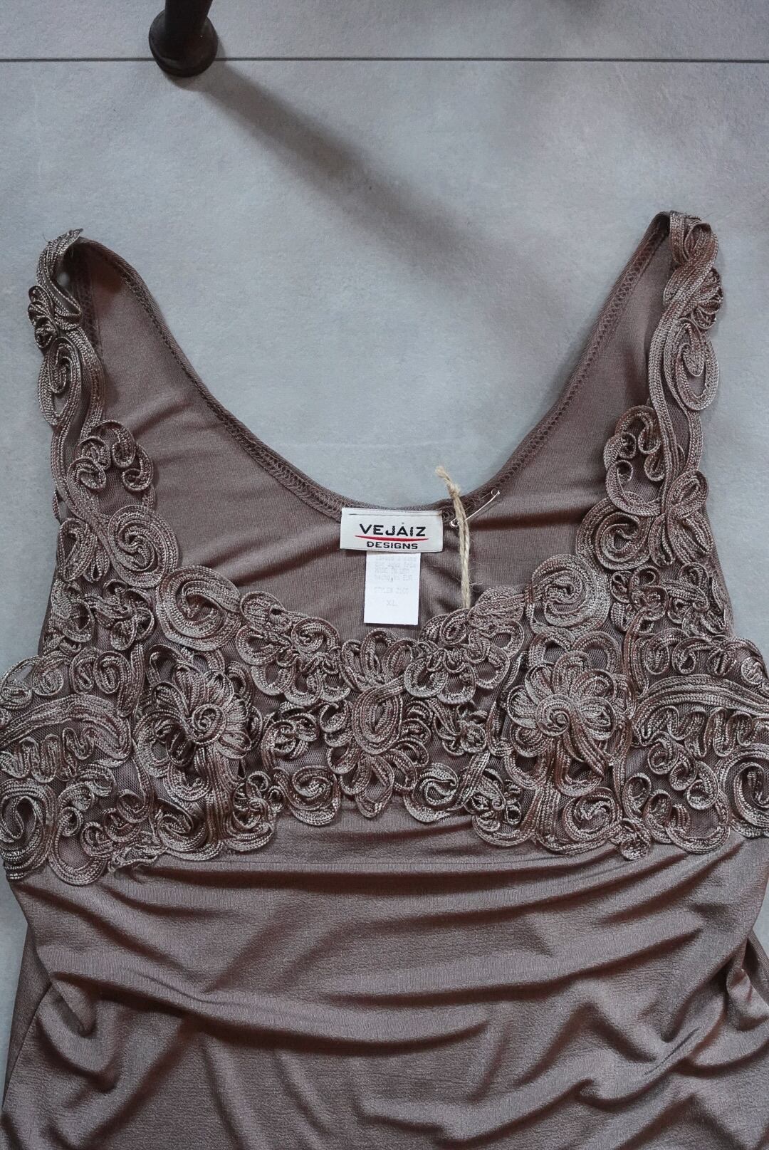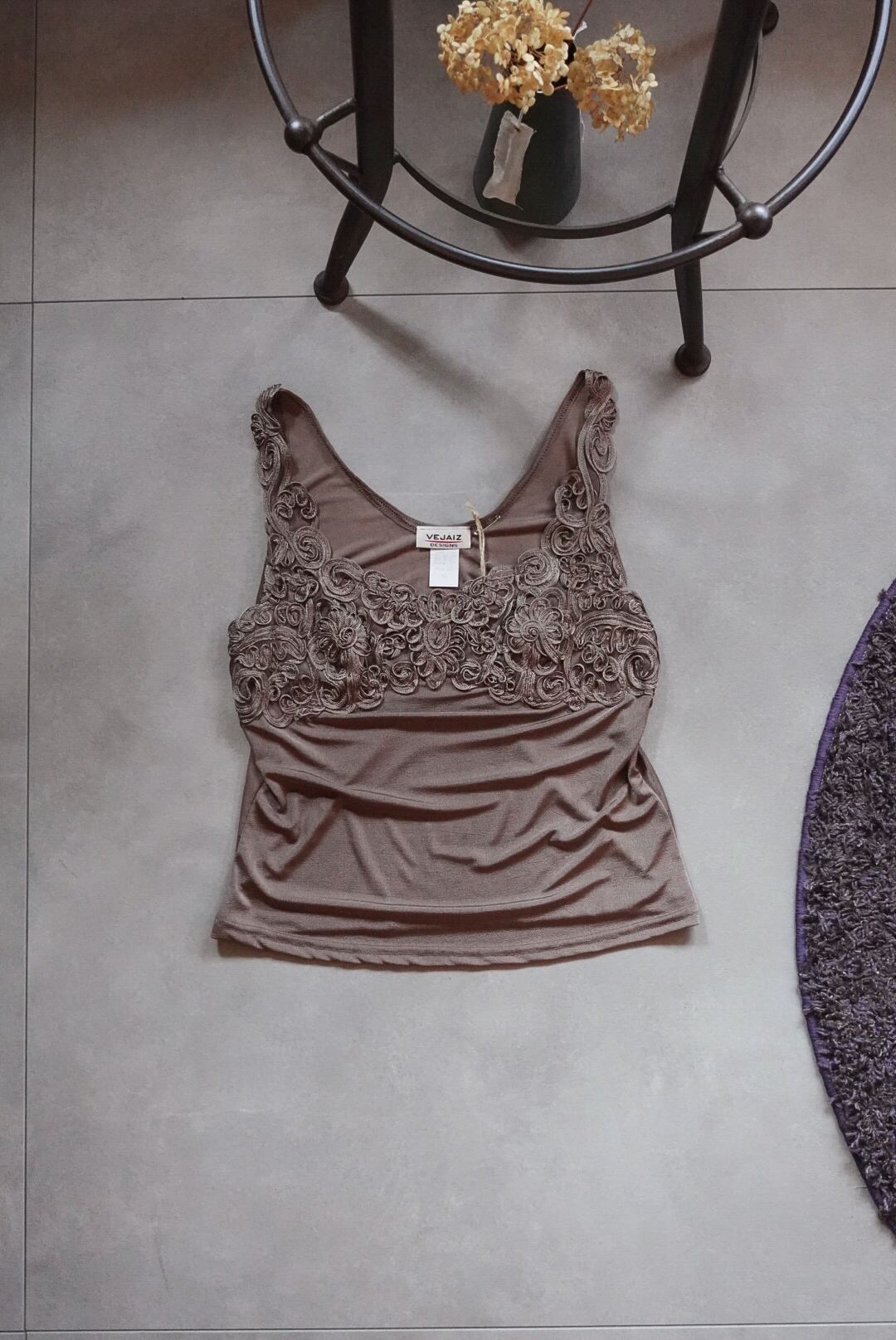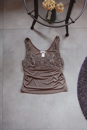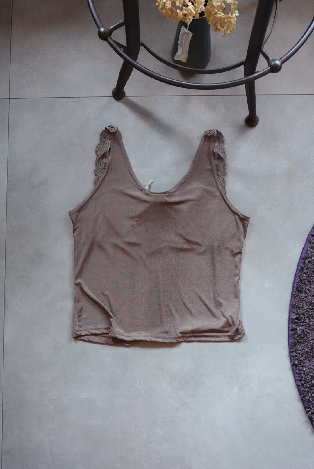 こちらは光沢感のあるブラウンのキャミソールに、立体感のあるレース刺繍が贅沢にあしらわれた一枚。