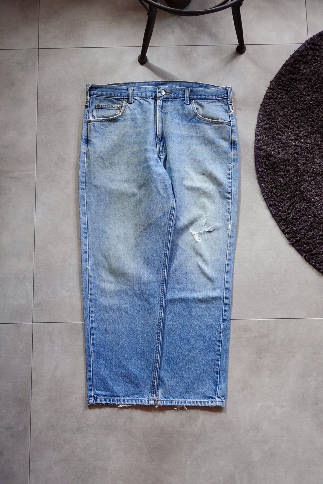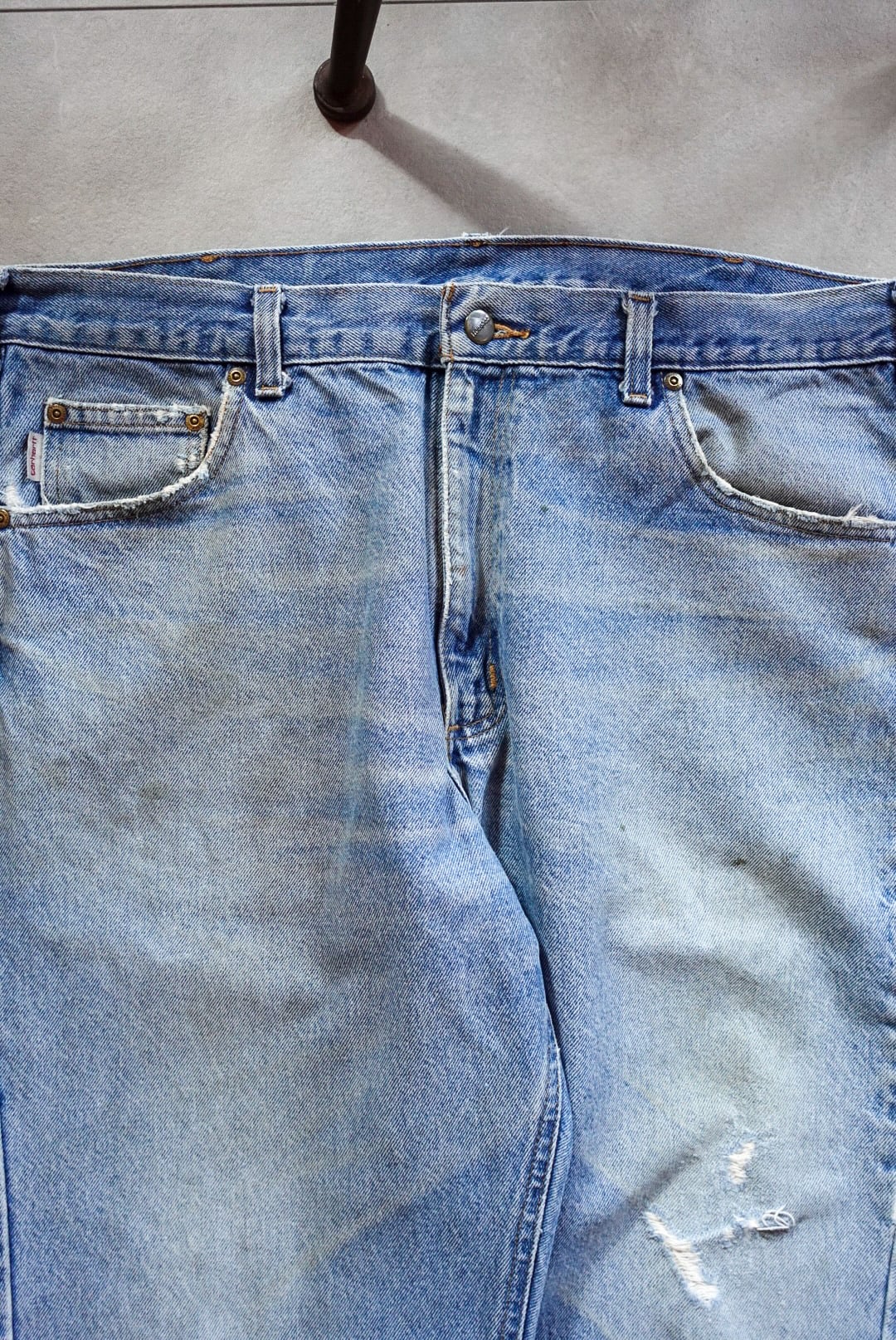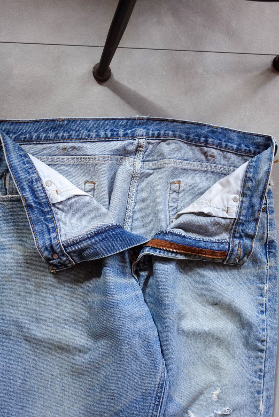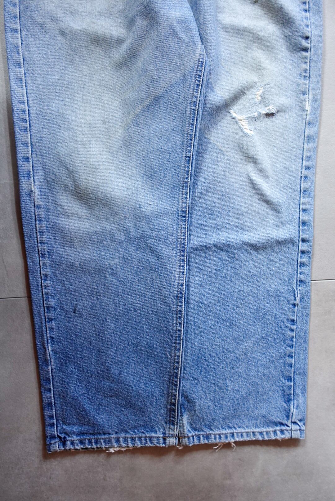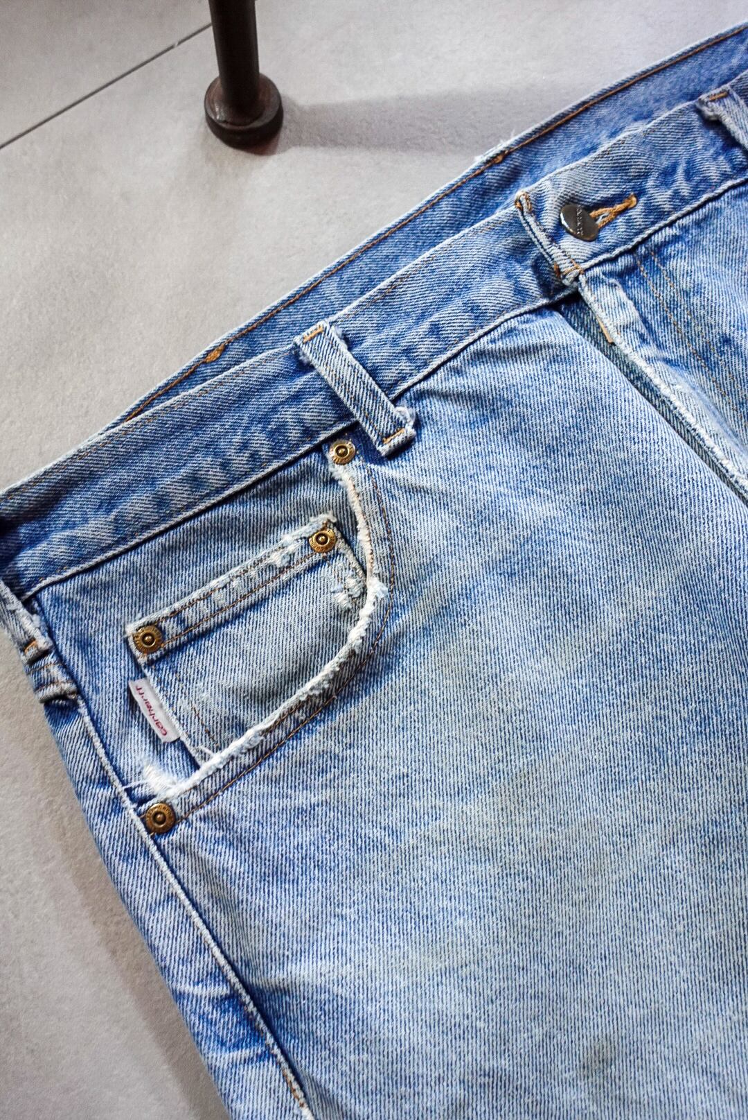 程よく色落ちしたライトブルーに、膝部分のダメージと裾のほつれが加わり、リアルなワーク感と古着らしい味を纏った一本です。