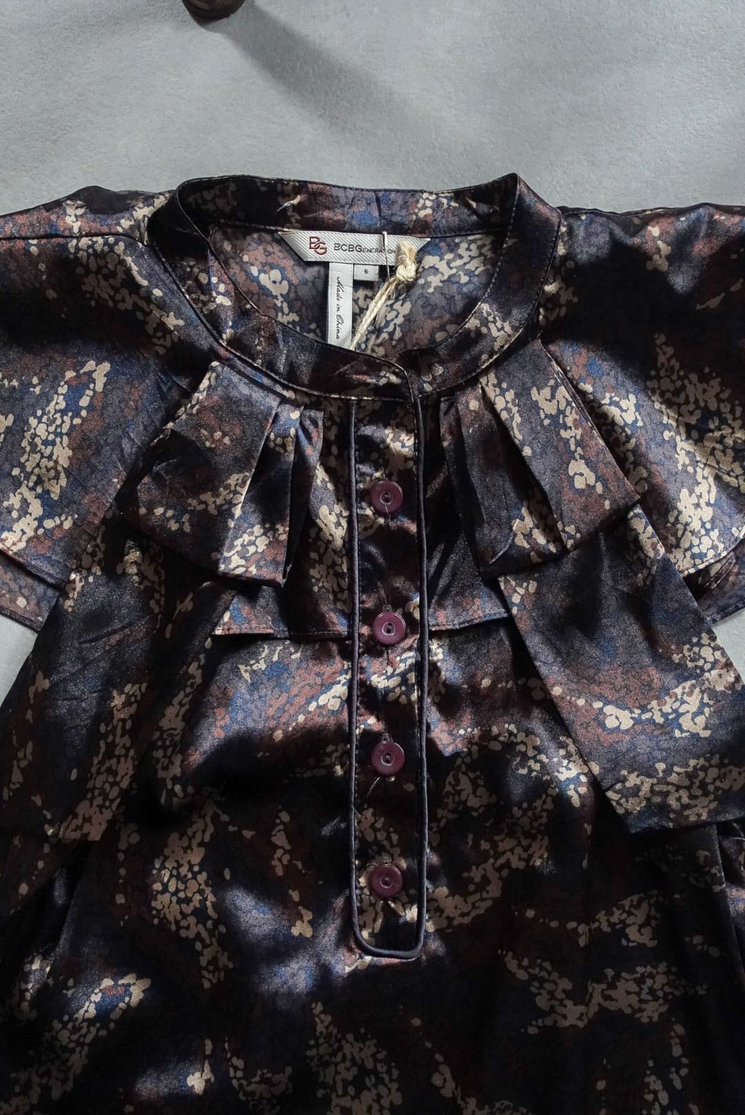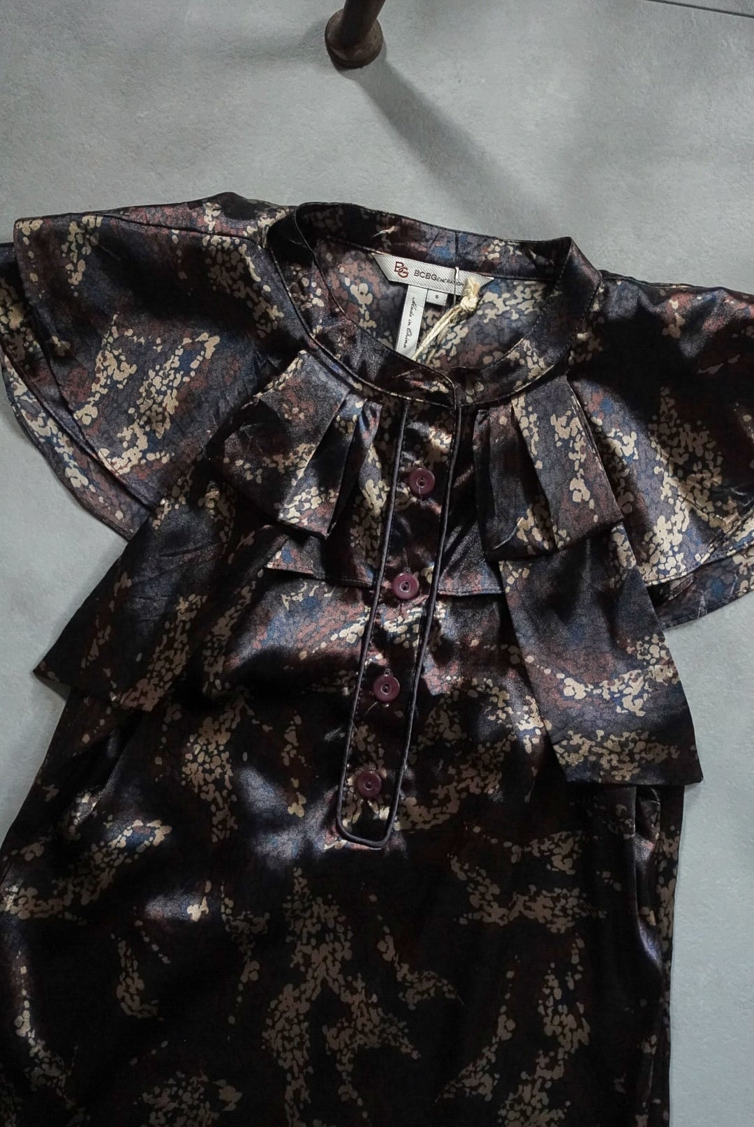 胸元に重ねられたフリルがロマンティックで、フレンチスリーブのシルエットが女性らしさを引き立てます。