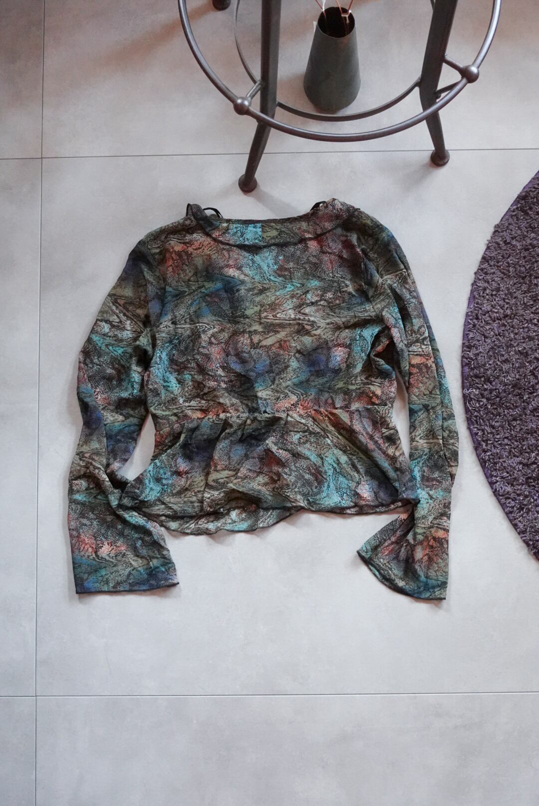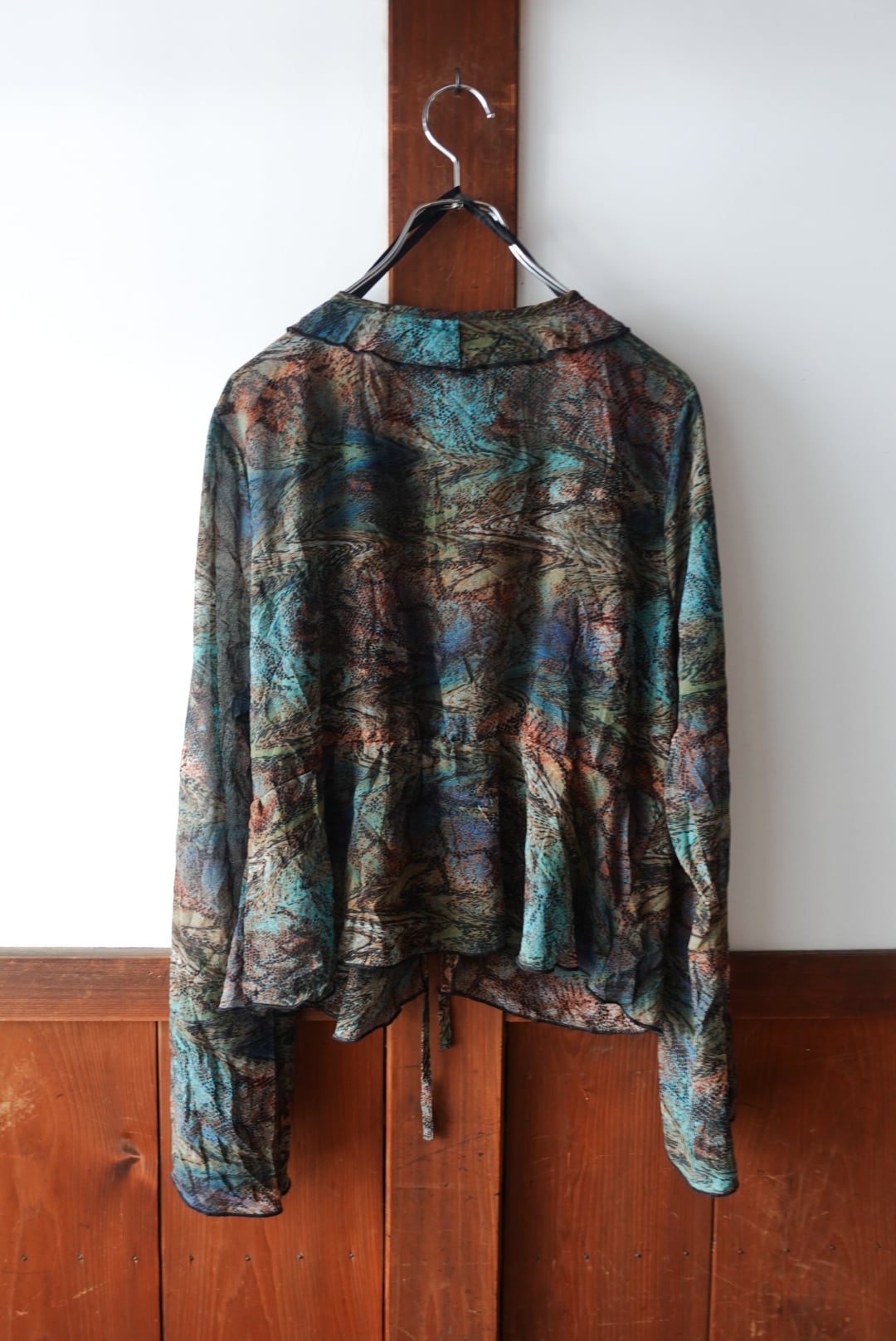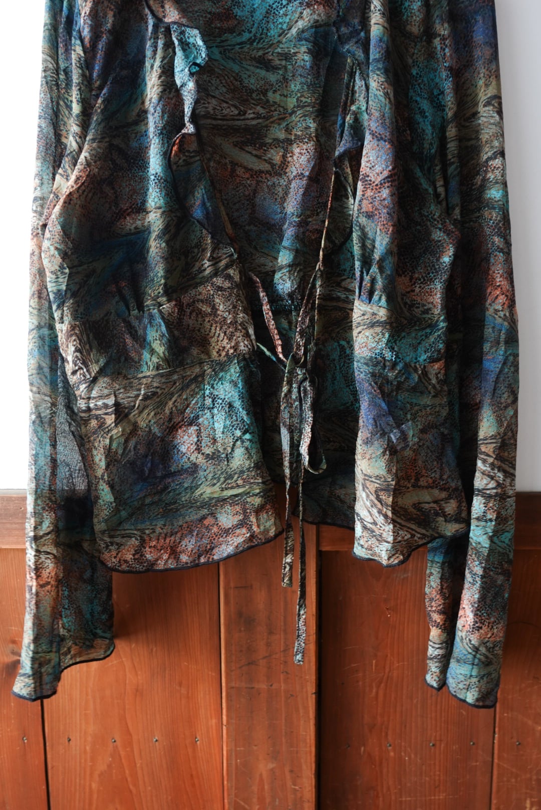 色が滲むように混ざり合ったマーブル柄のシースルーブラウス。