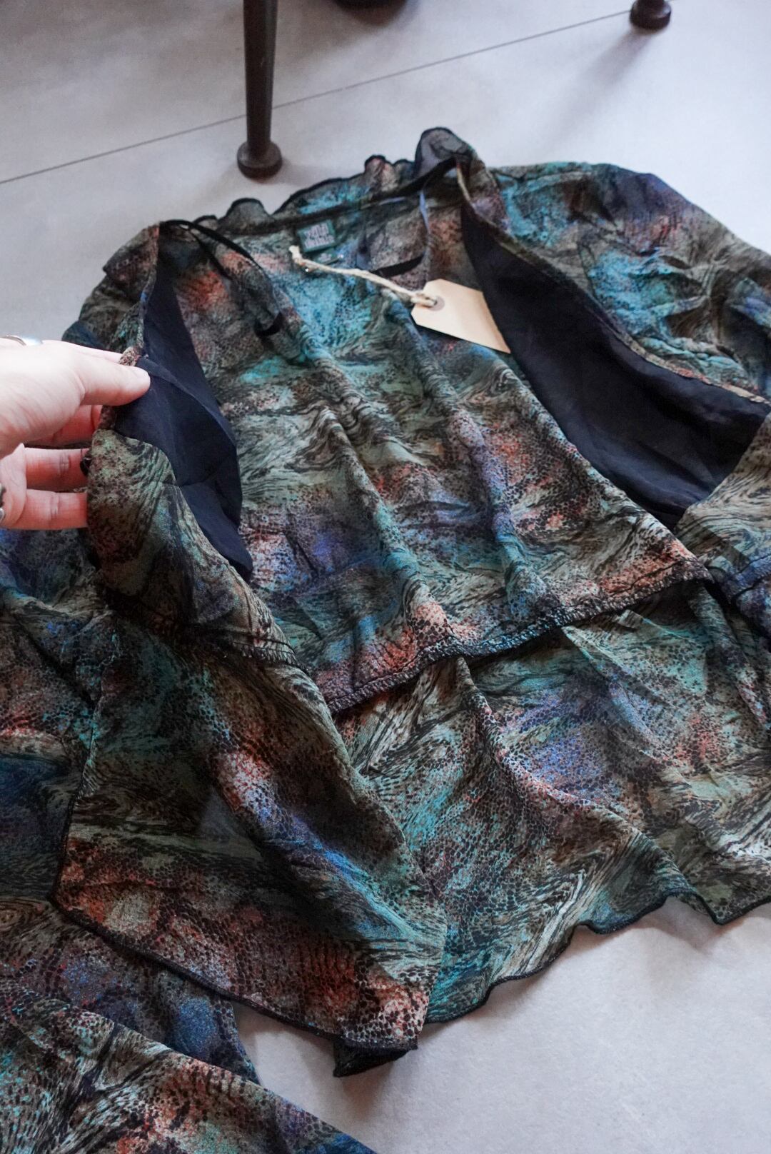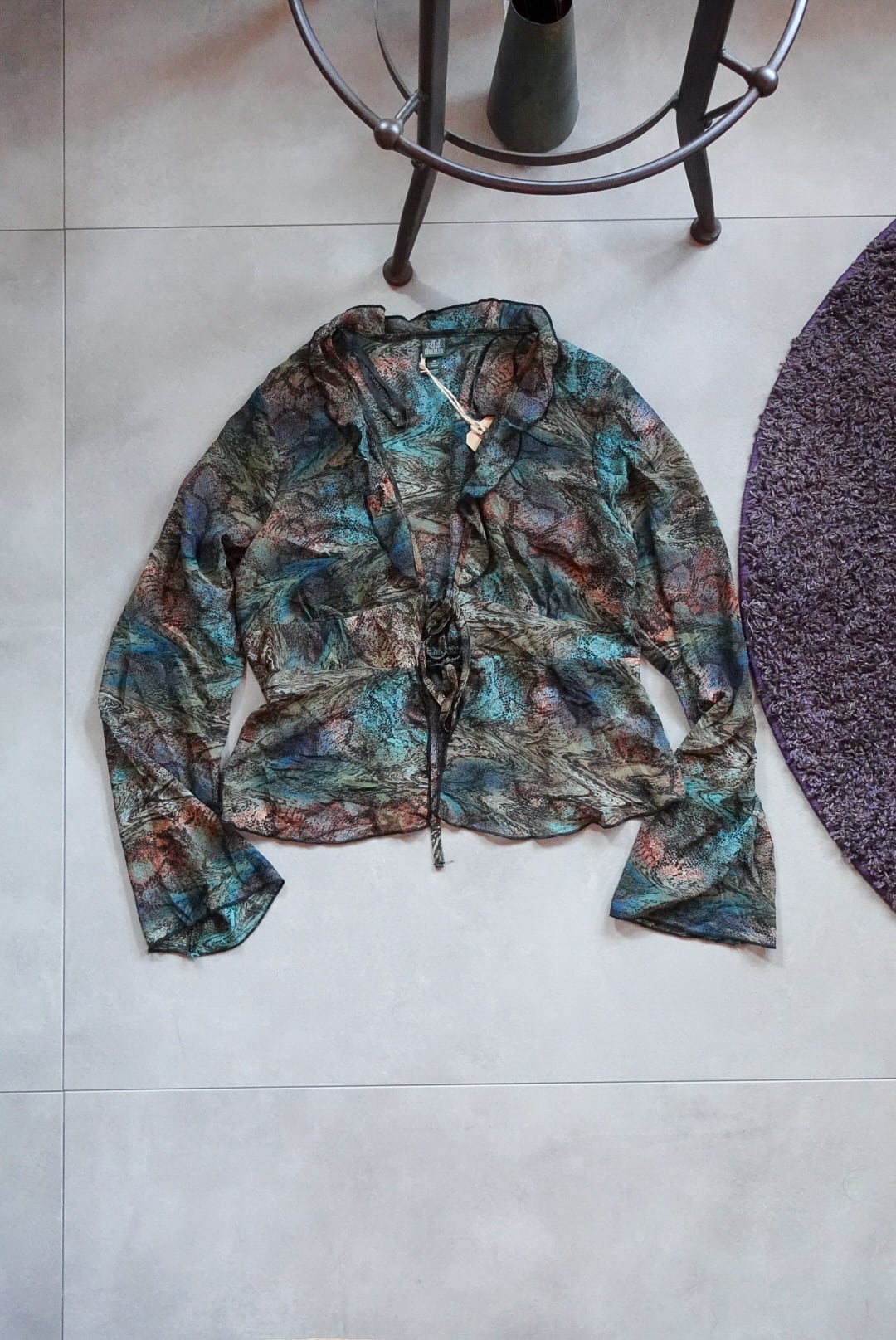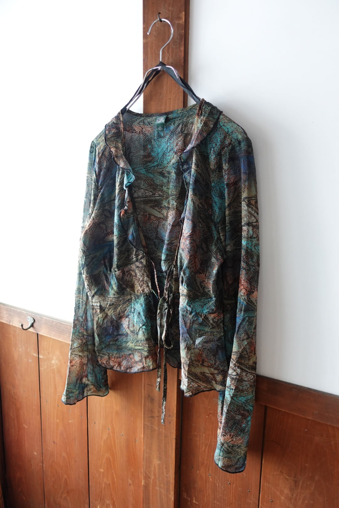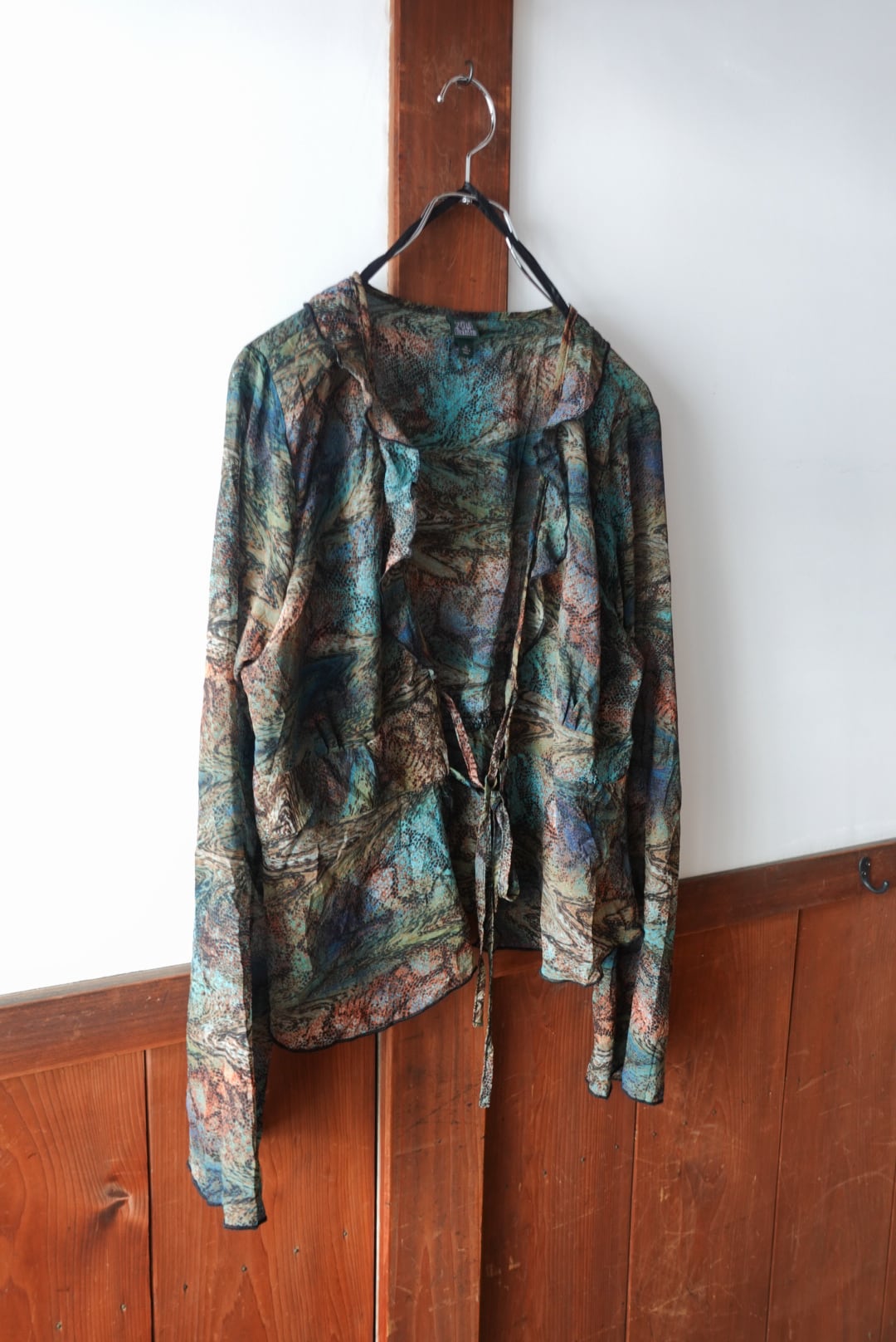 色が滲むように混ざり合ったマーブル柄のシースルーブラウス。