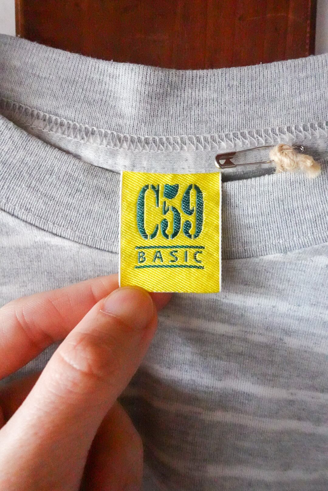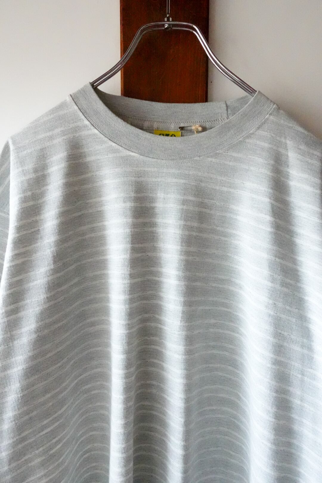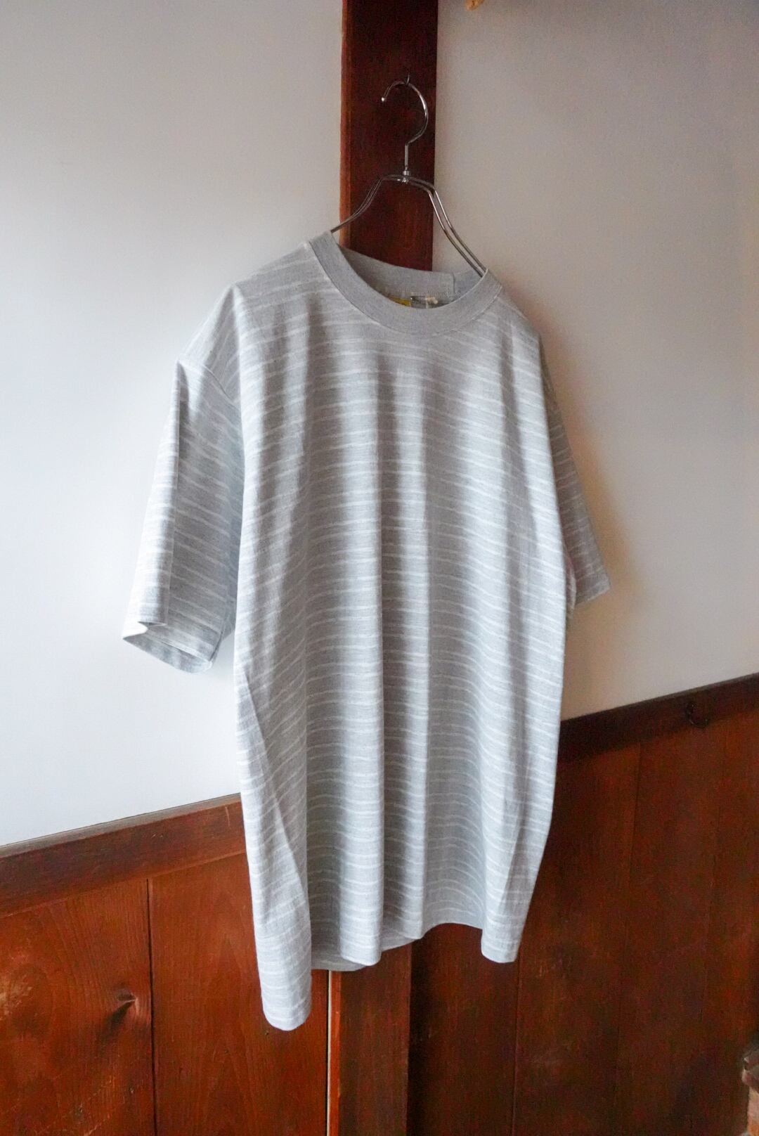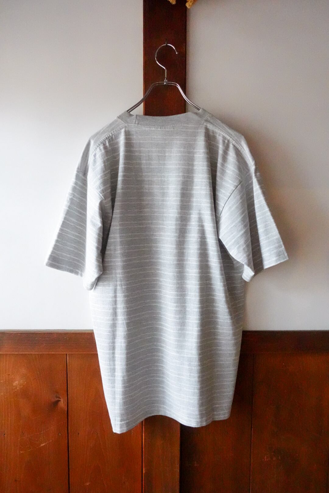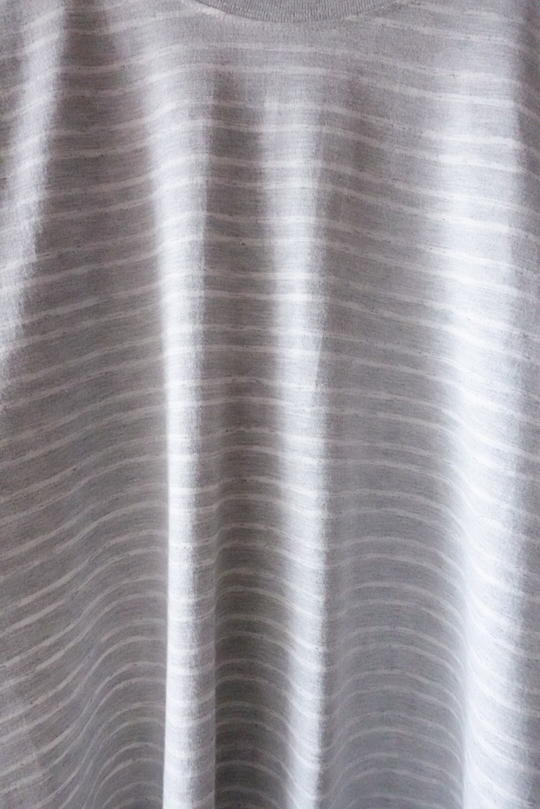 淡いグレーにホワイトの細ボーダーが入った、ミニマルなTシャツ。