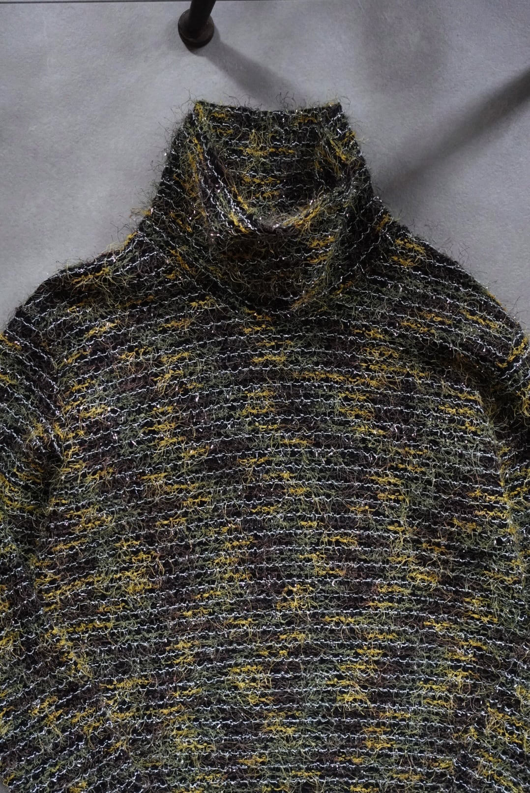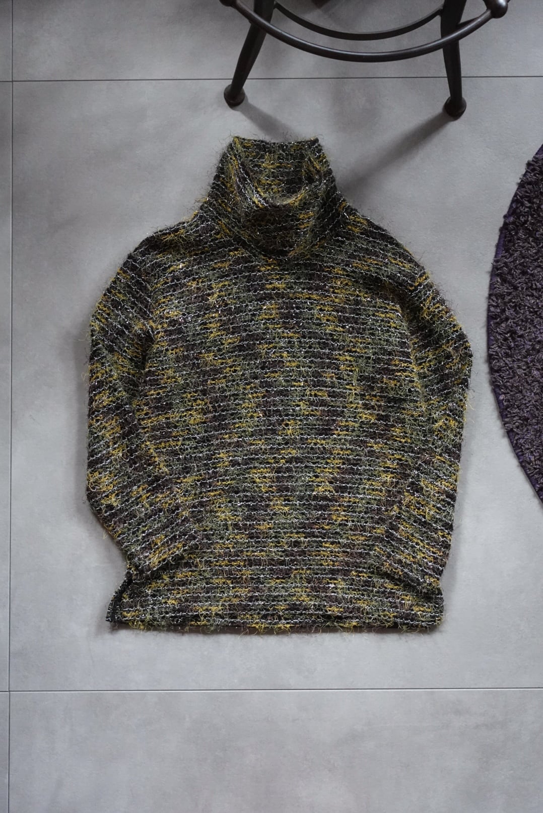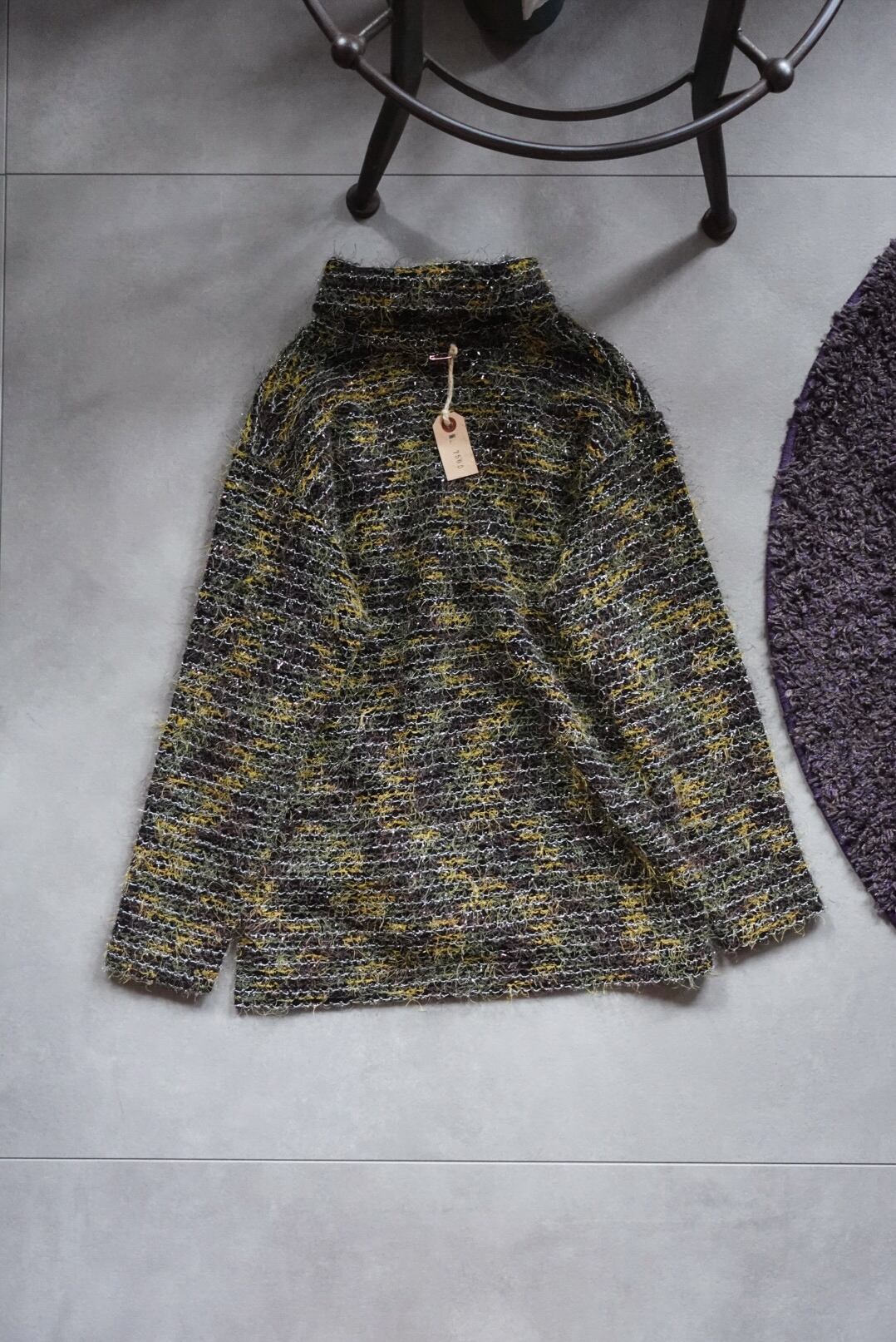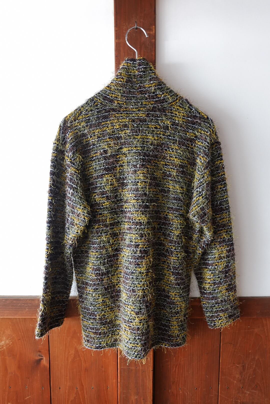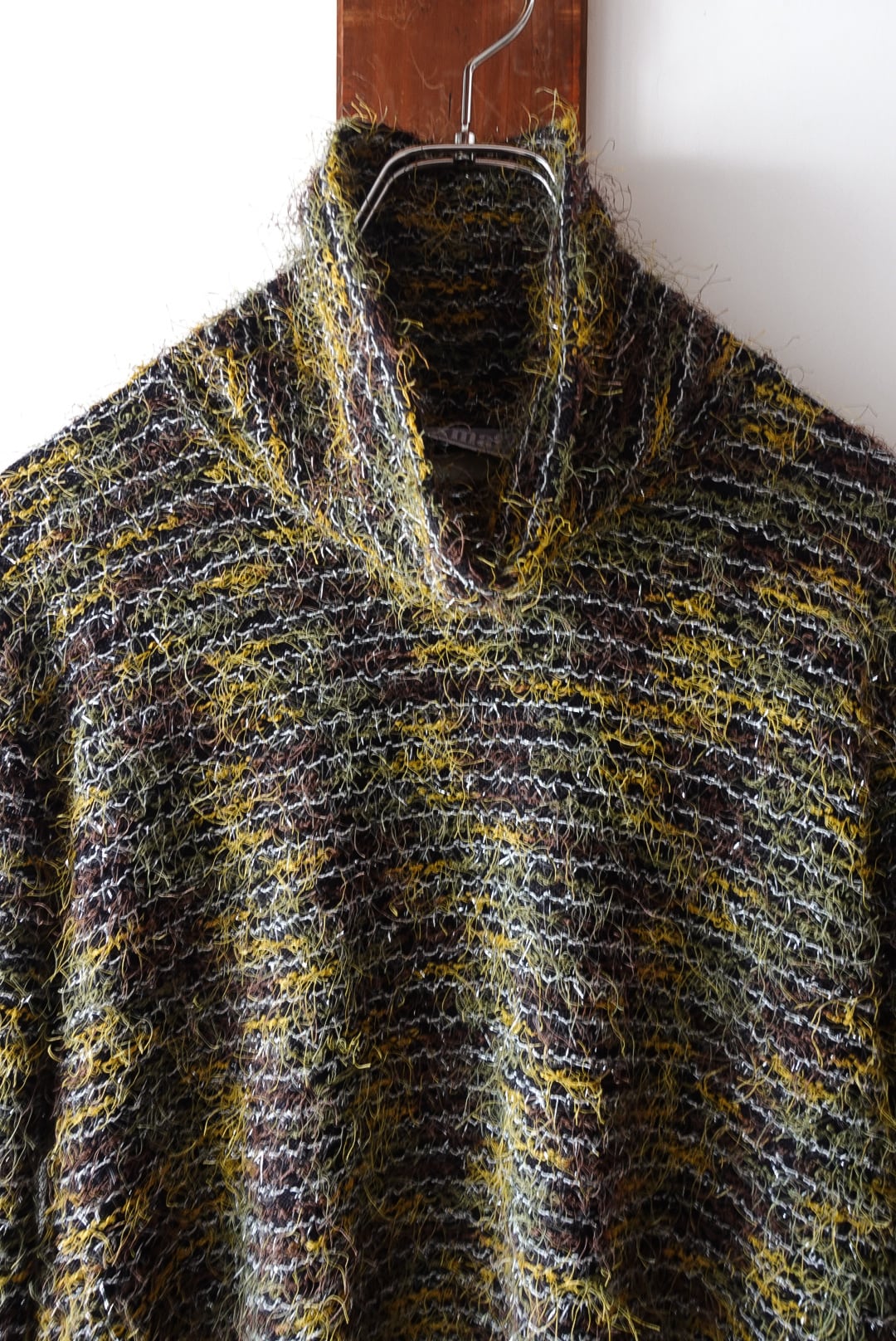 ブラウンをベースに、イエローやカーキの糸がミックスされ、まるで絵画のような奥行きあるカラーリングを生み出しています。毛足のある素材感が温もりを感じさせつつ、軽やかな抜け感も兼ね備えた一枚です。1枚で着ても存在感抜群。
