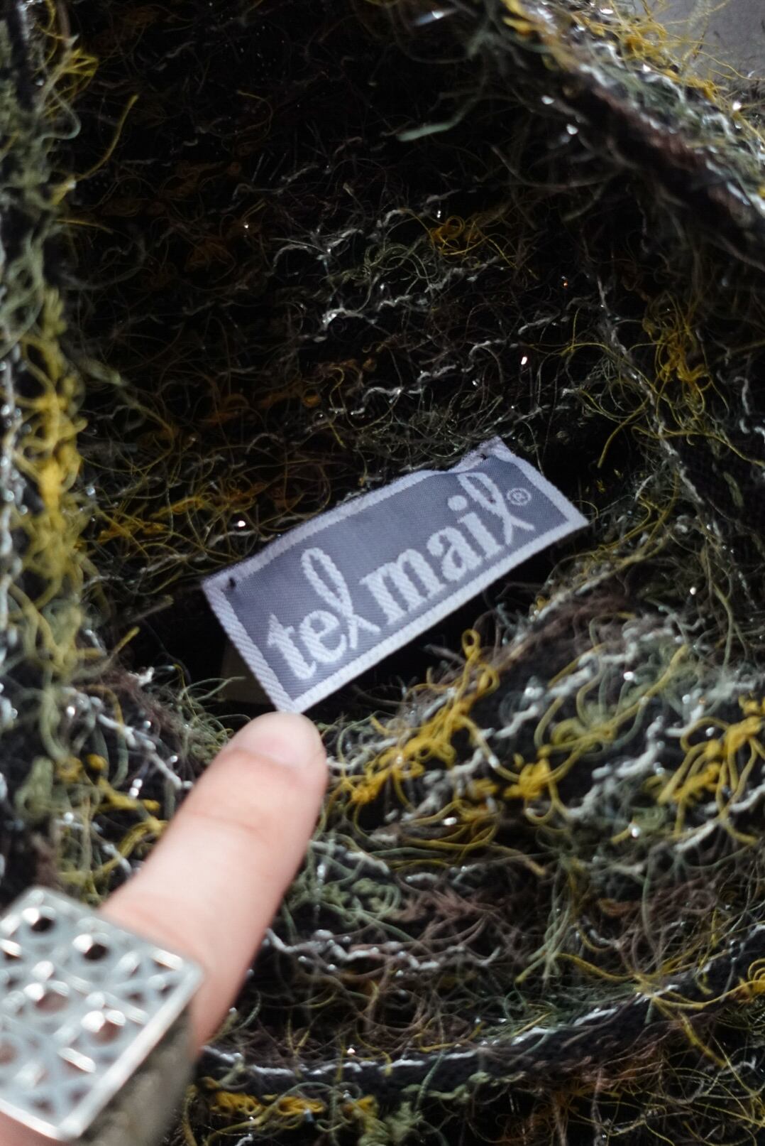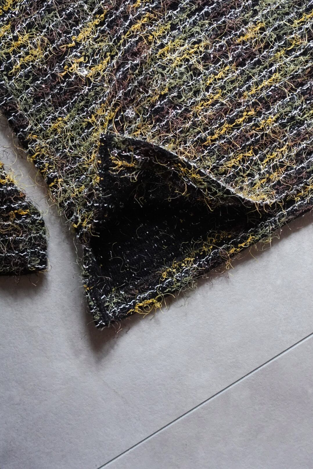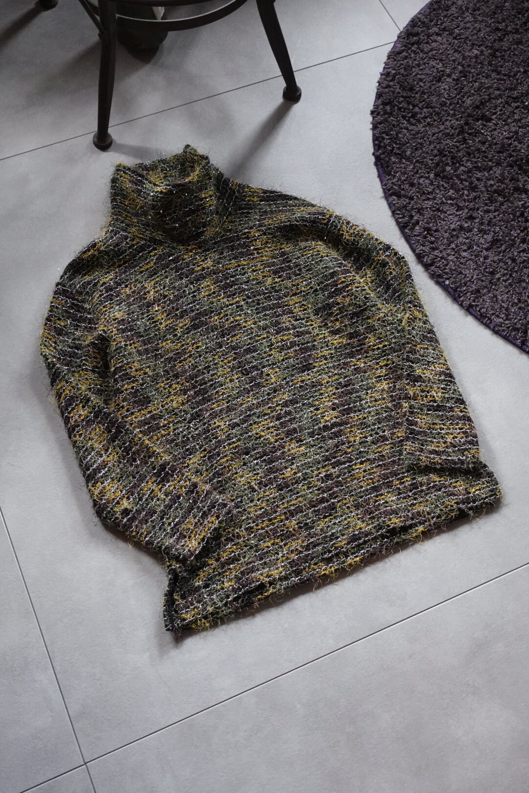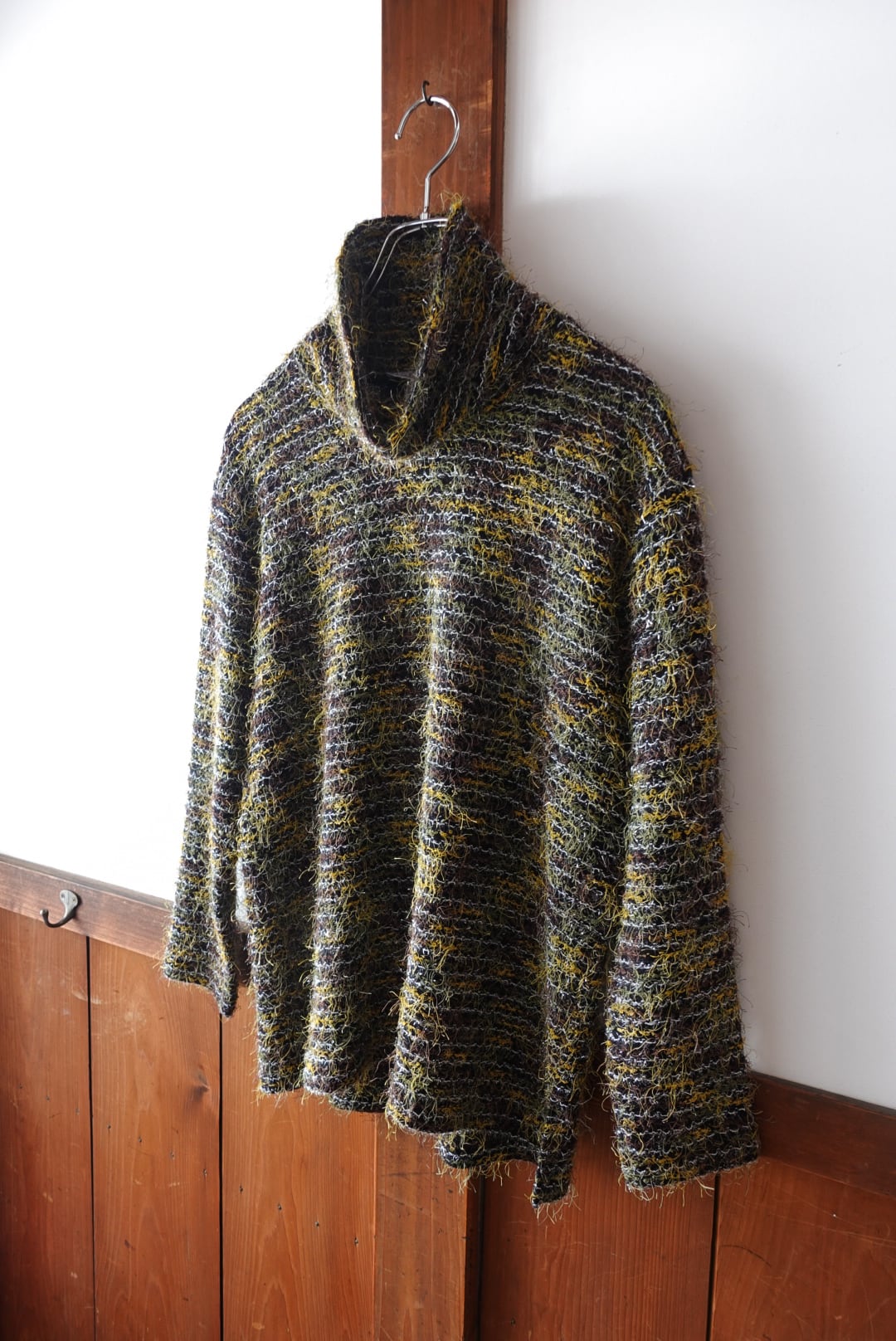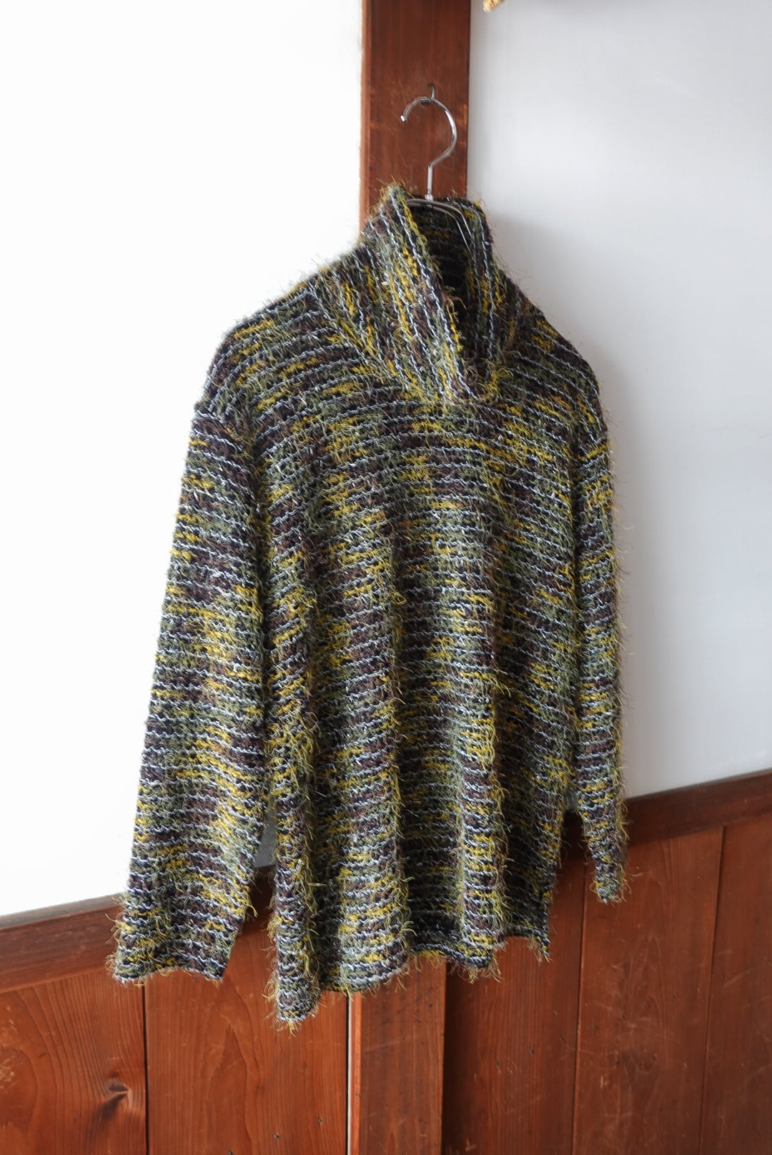 ブラウンをベースに、イエローやカーキの糸がミックスされ、まるで絵画のような奥行きあるカラーリングを生み出しています。毛足のある素材感が温もりを感じさせつつ、軽やかな抜け感も兼ね備えた一枚です。1枚で着ても存在感抜群。
