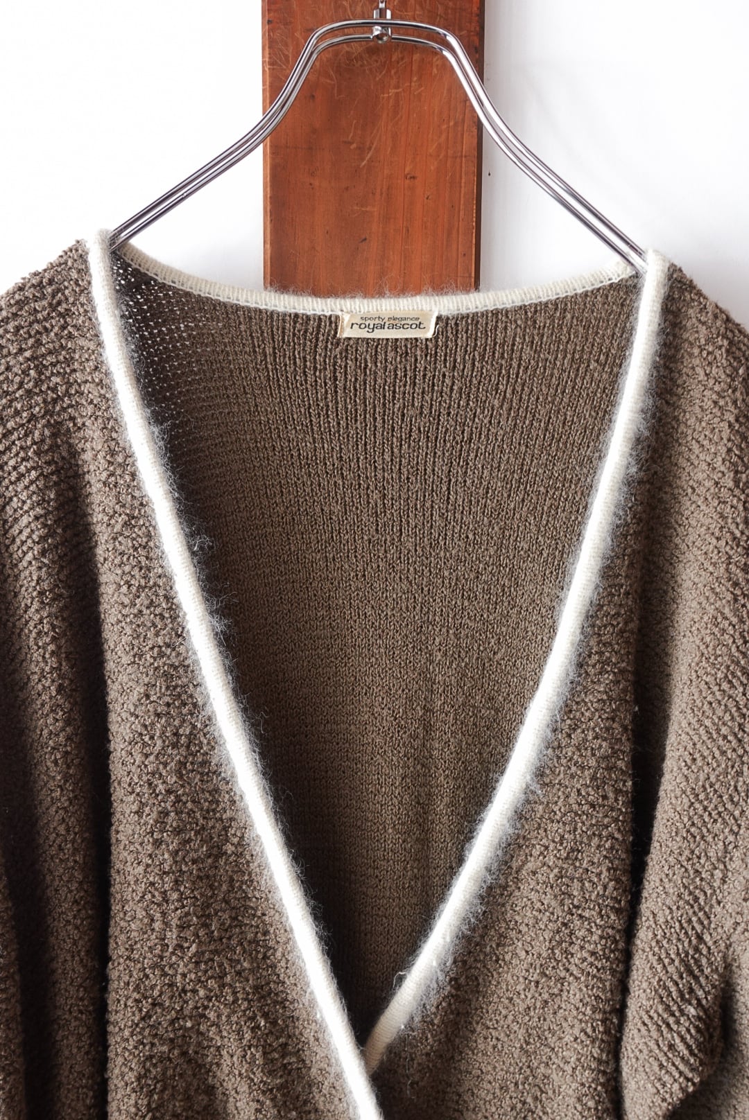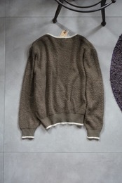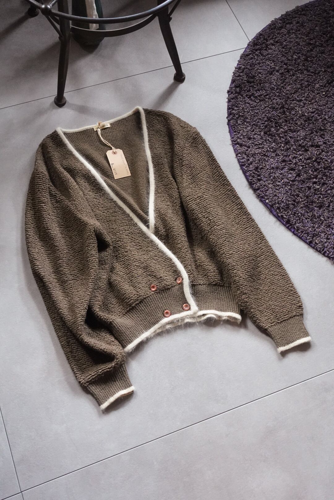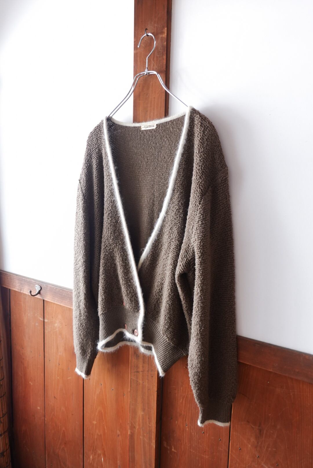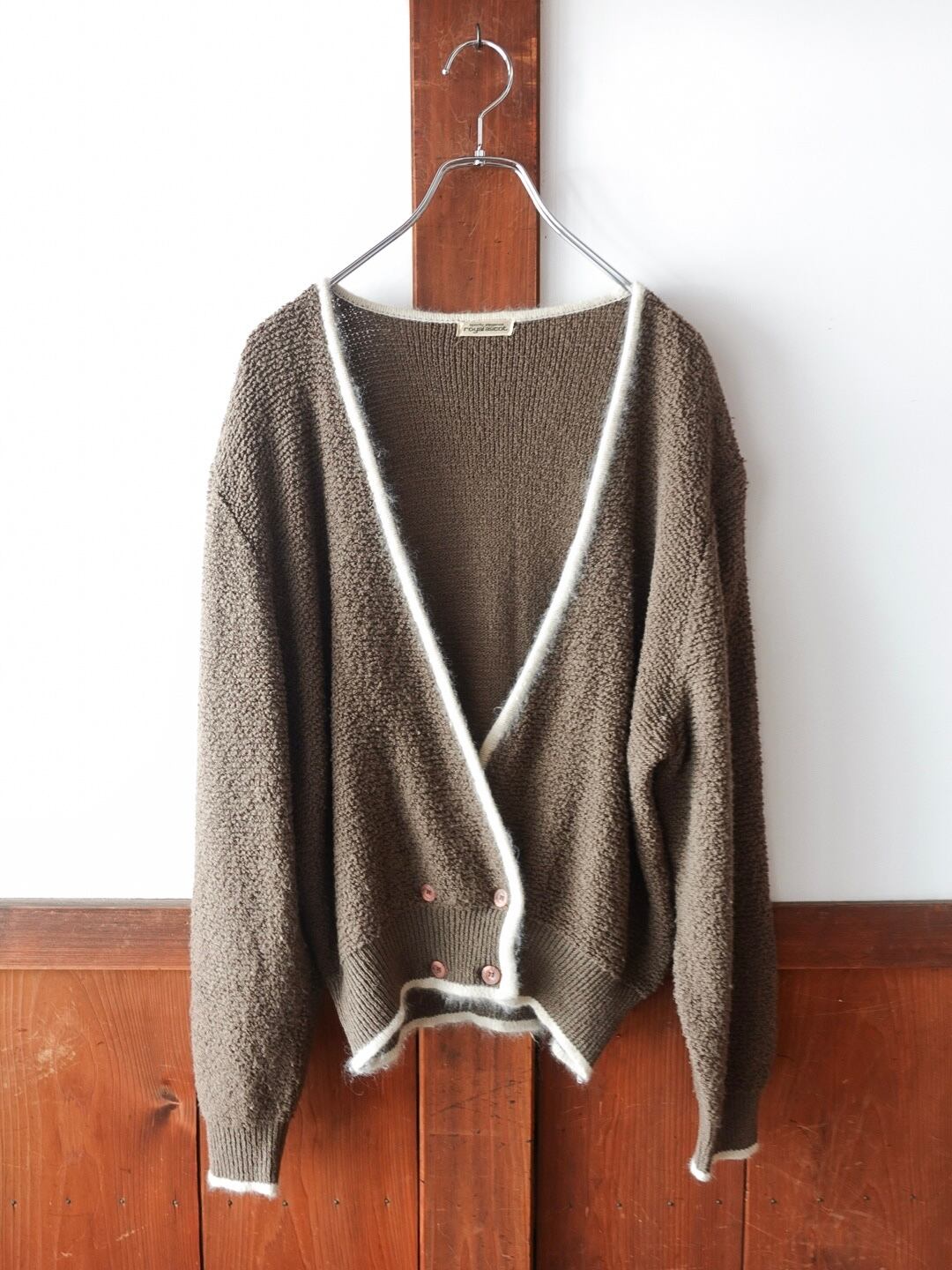 深みのあるブラウンに、ホワイトのパイピングが映えるカーディガン。