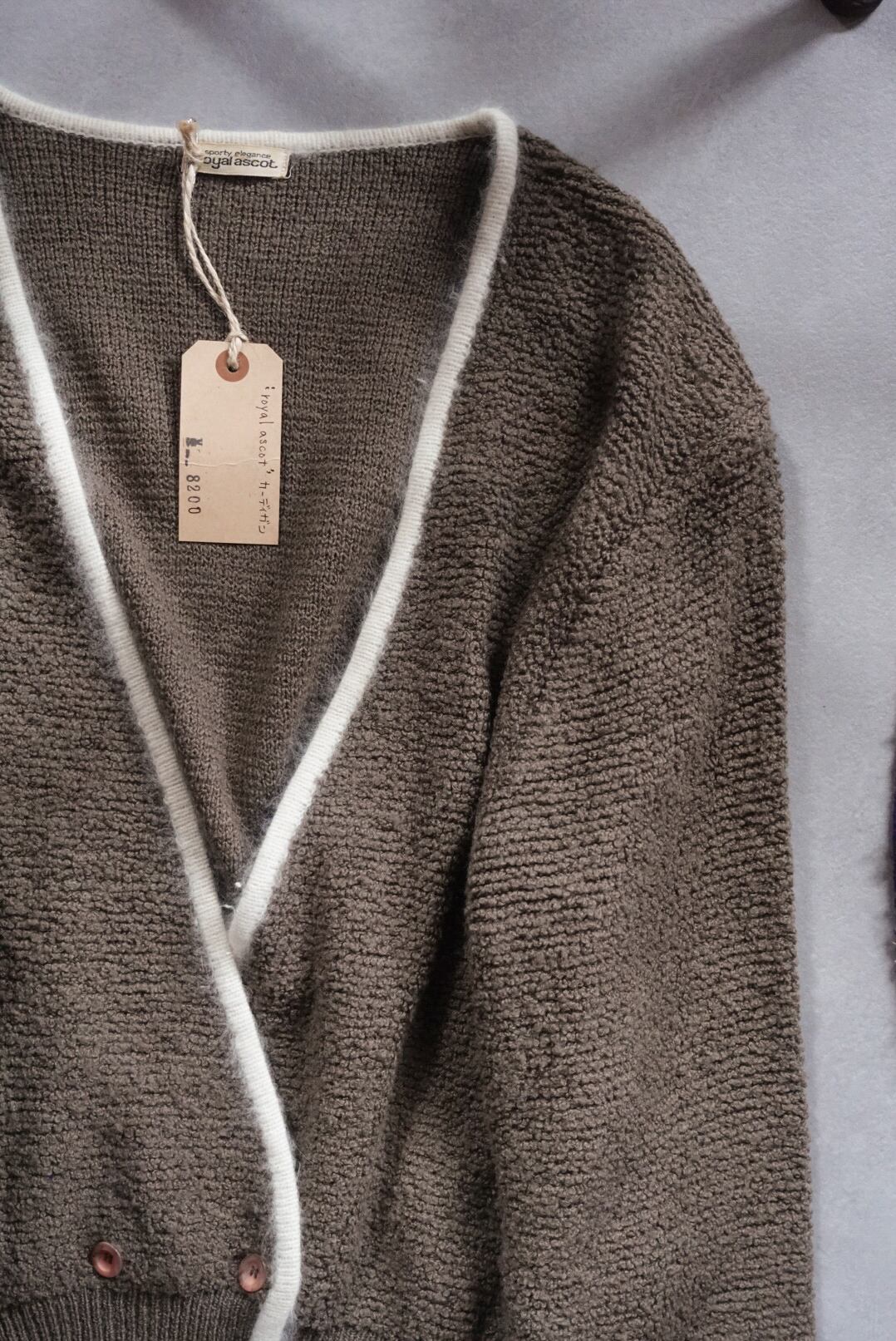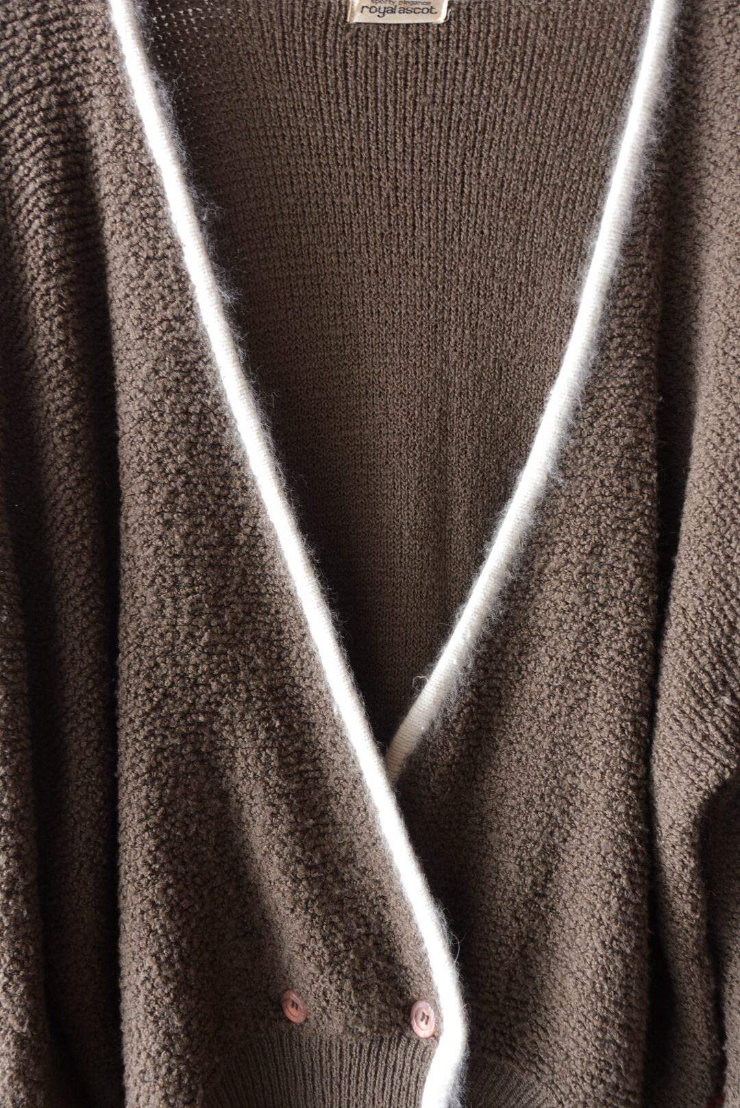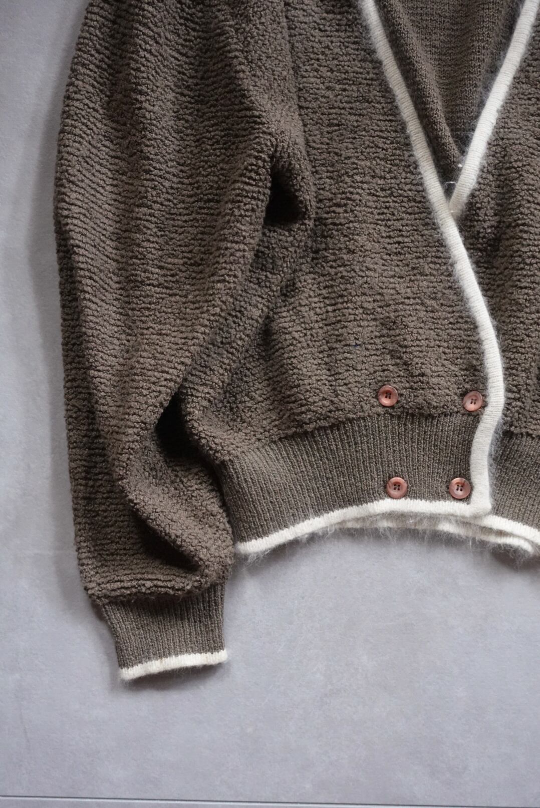 深みのあるブラウンに、ホワイトのパイピングが映えるカーディガン。