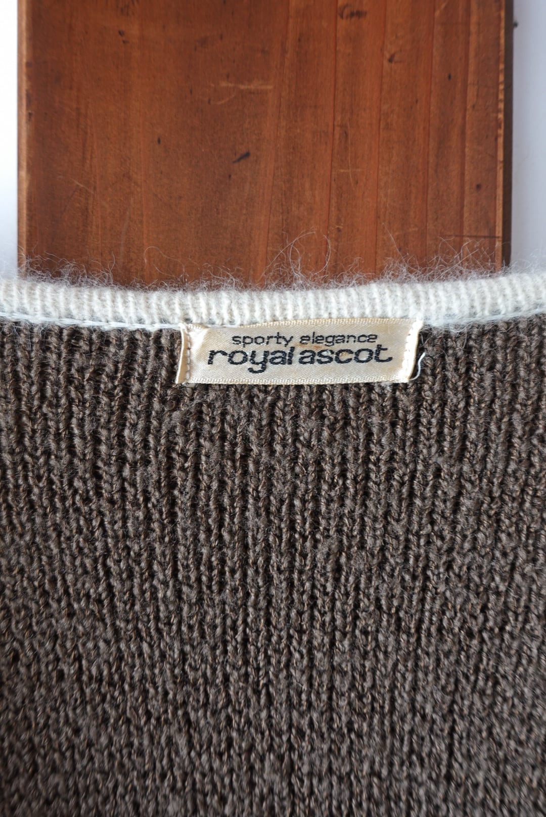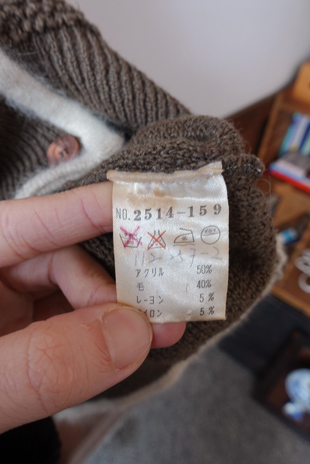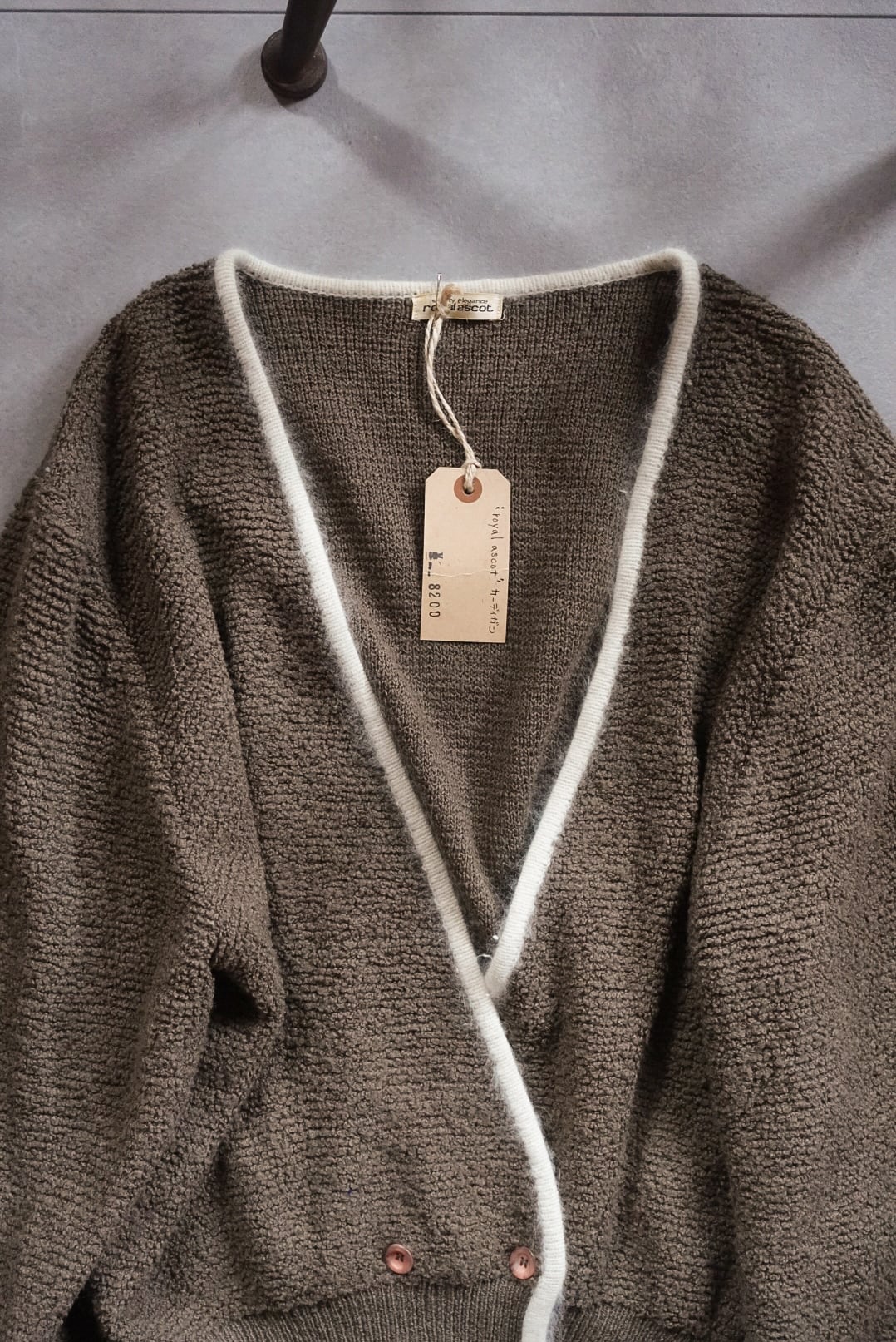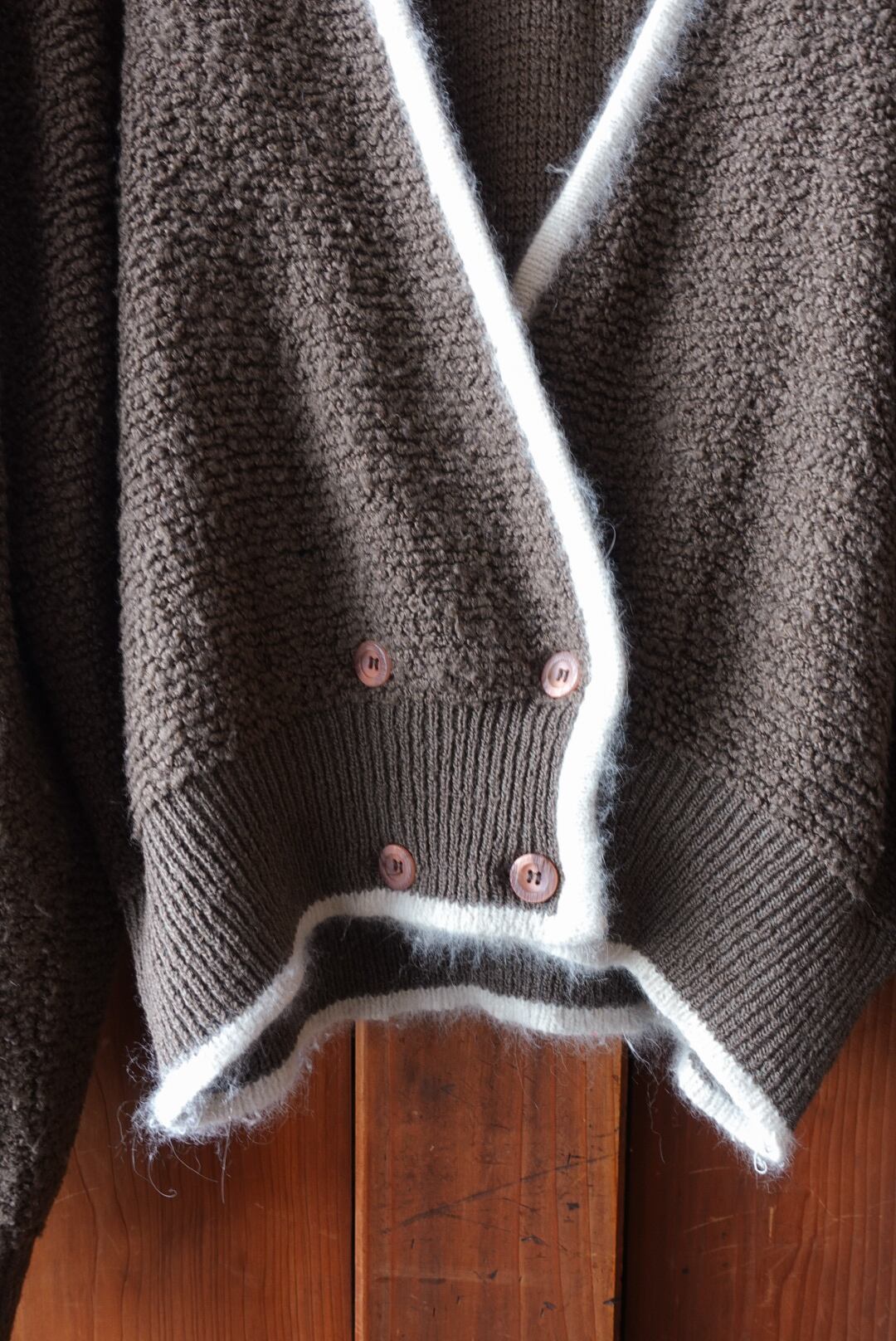 深みのあるブラウンに、ホワイトのパイピングが映えるカーディガン。