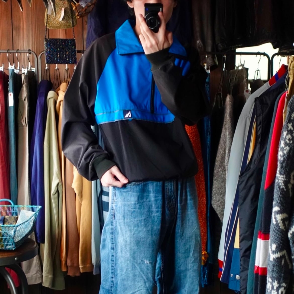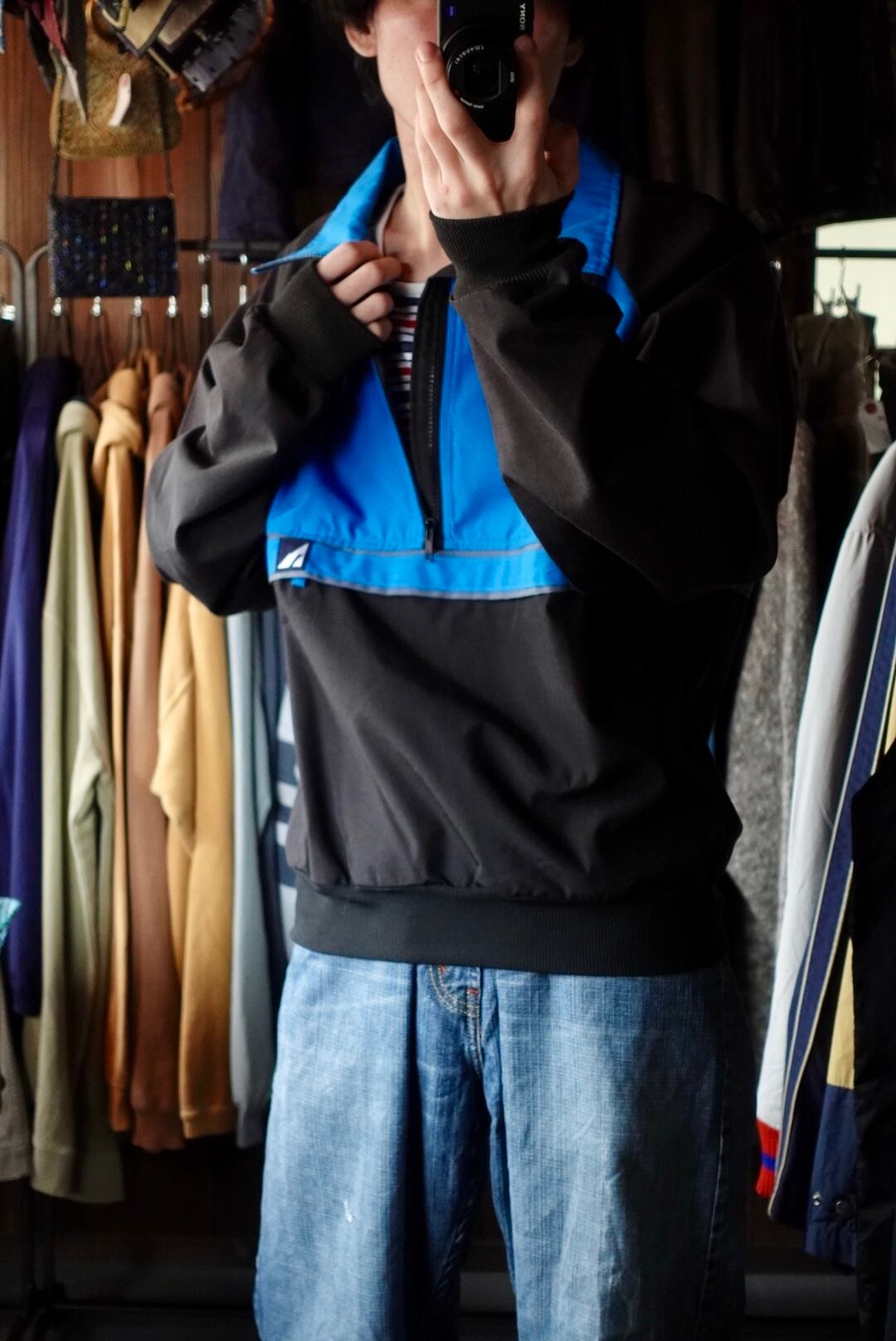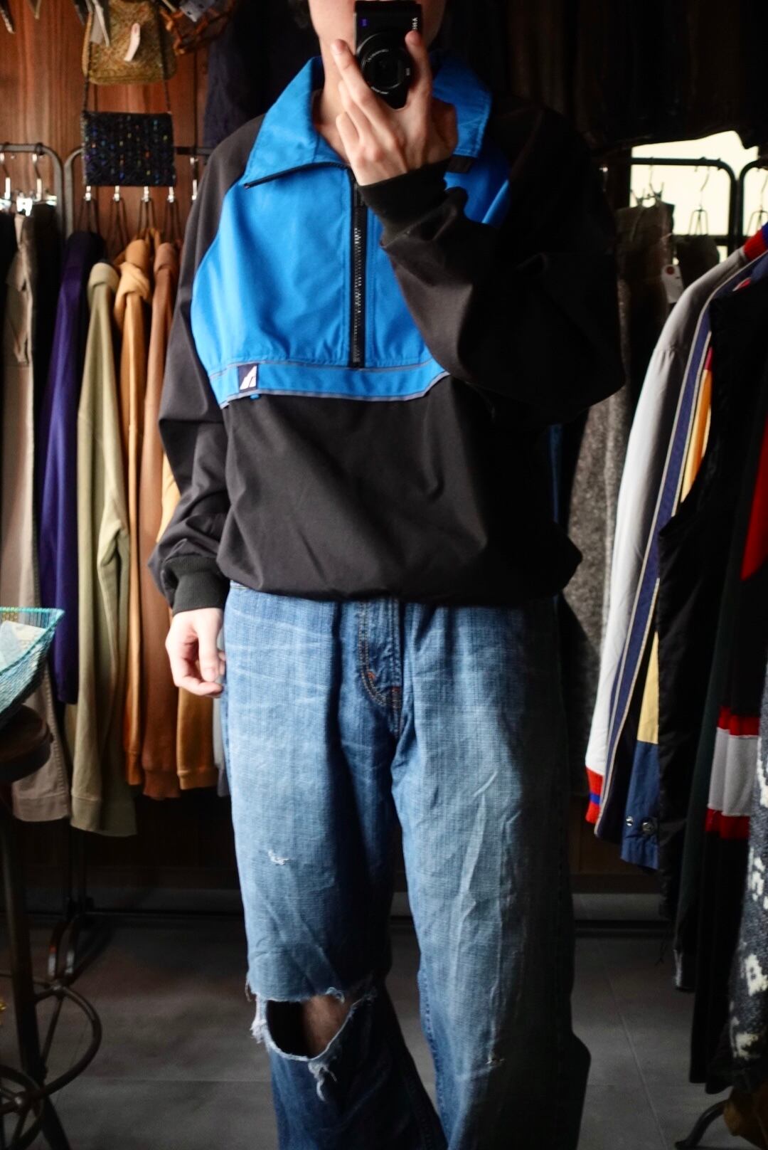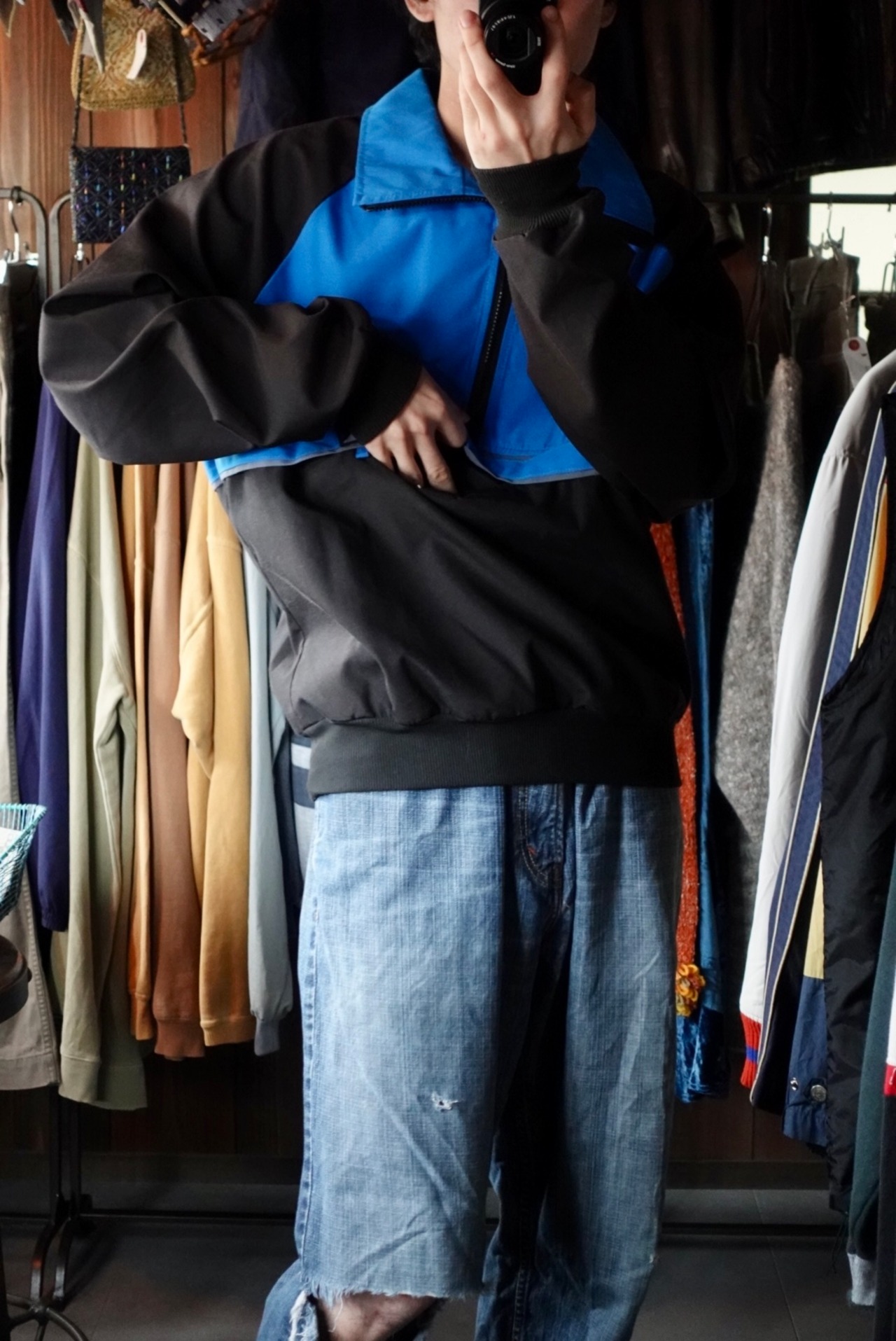 綺麗な青と黒のハーフジップ。生地他のナイロンアイテムよりも少し硬めで、綺麗なシルエットのまま着用して頂けます。裾元がかなりキュッと絞られており、単丈の様なスタイリッシュな着こなしとなります。デニムと合わせシティ系というか、今どきの若者ファッションが楽しめます。