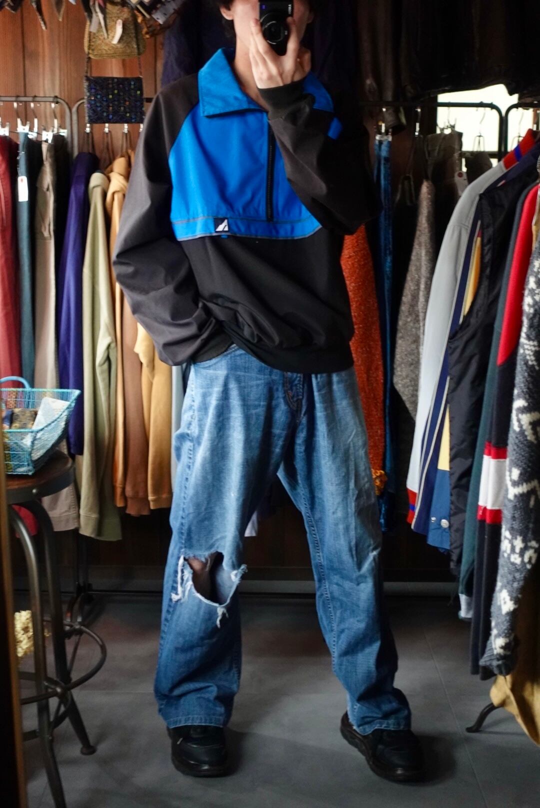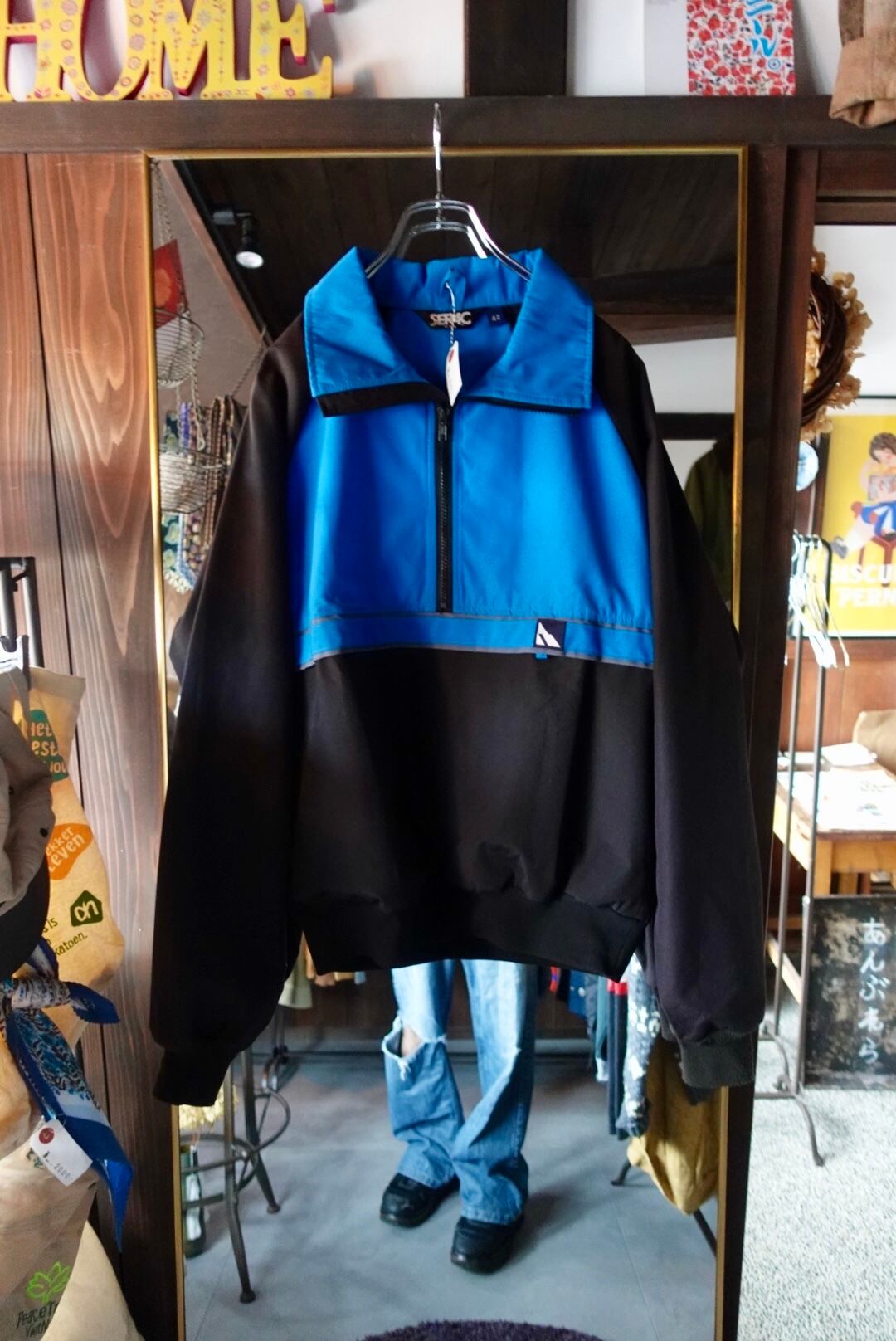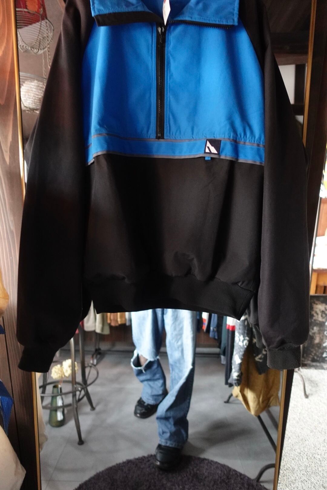 綺麗な青と黒のハーフジップ。生地他のナイロンアイテムよりも少し硬めで、綺麗なシルエットのまま着用して頂けます。裾元がかなりキュッと絞られており、単丈の様なスタイリッシュな着こなしとなります。デニムと合わせシティ系というか、今どきの若者ファッションが楽しめます。