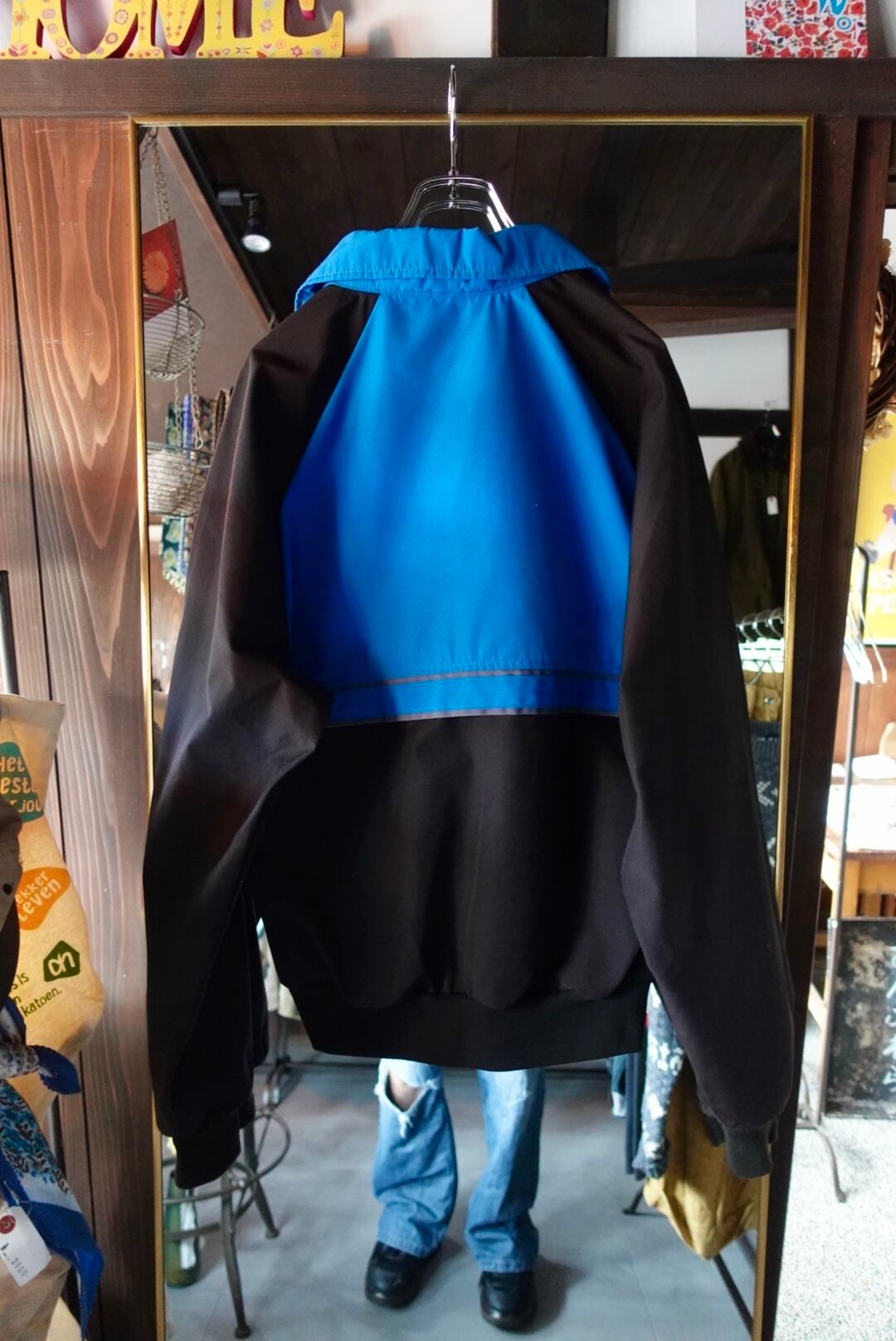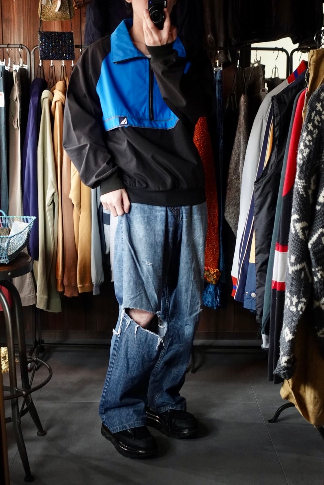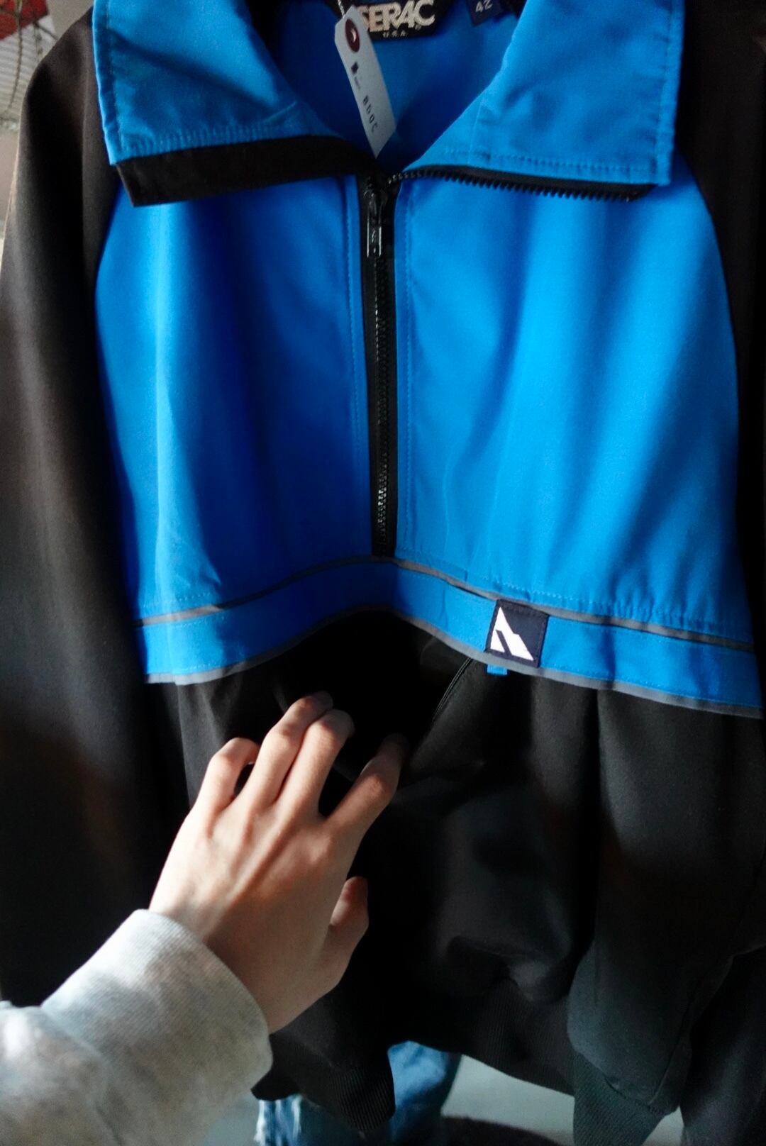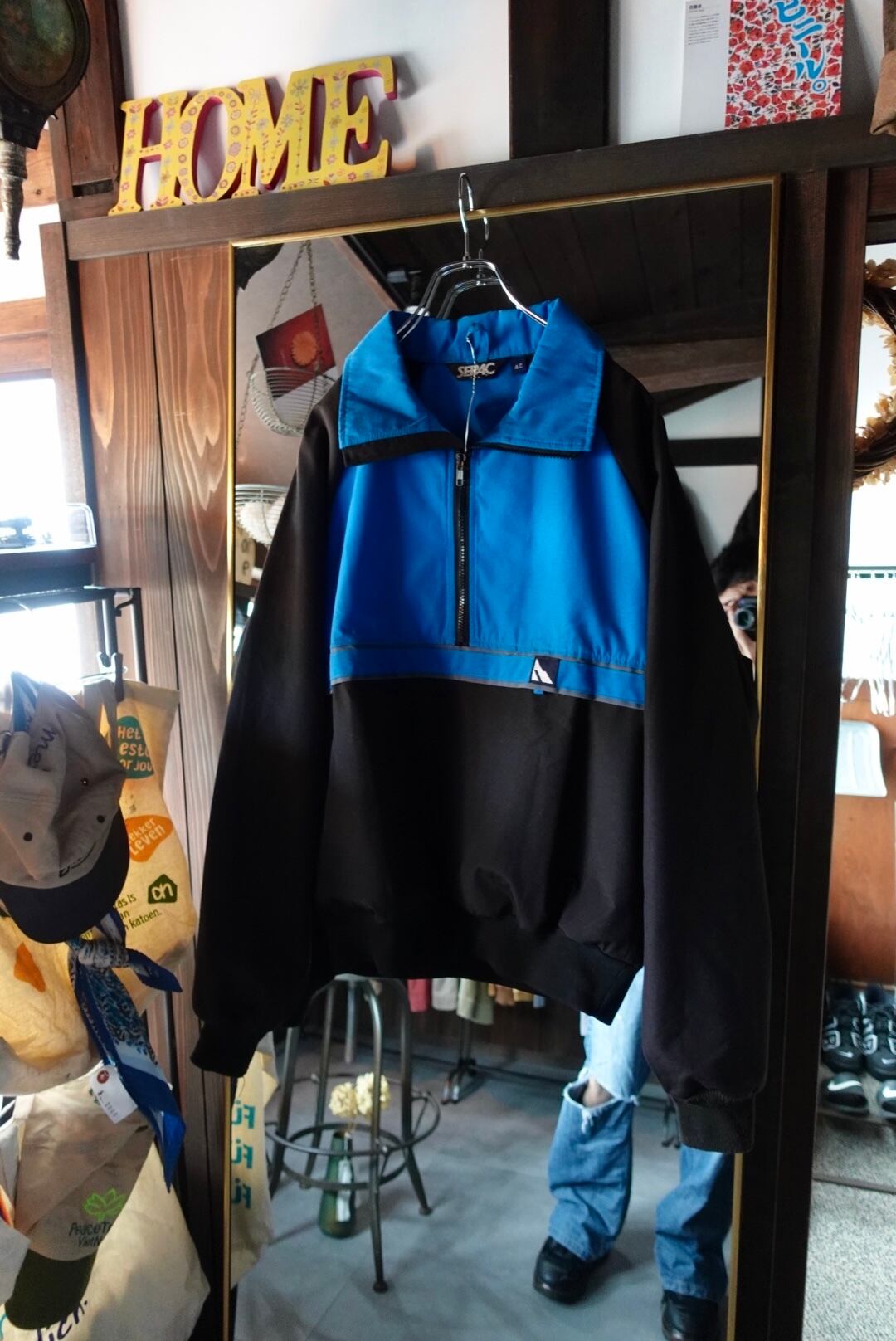 綺麗な青と黒のハーフジップ。生地他のナイロンアイテムよりも少し硬めで、綺麗なシルエットのまま着用して頂けます。裾元がかなりキュッと絞られており、単丈の様なスタイリッシュな着こなしとなります。デニムと合わせシティ系というか、今どきの若者ファッションが楽しめます。