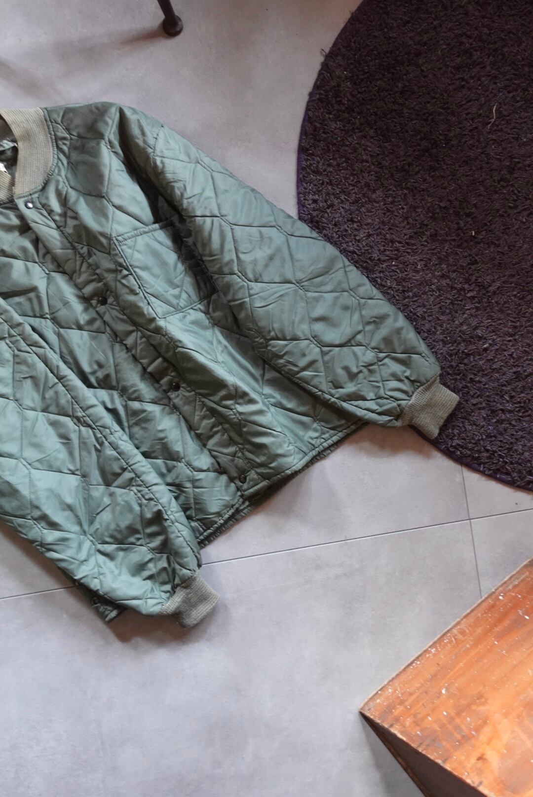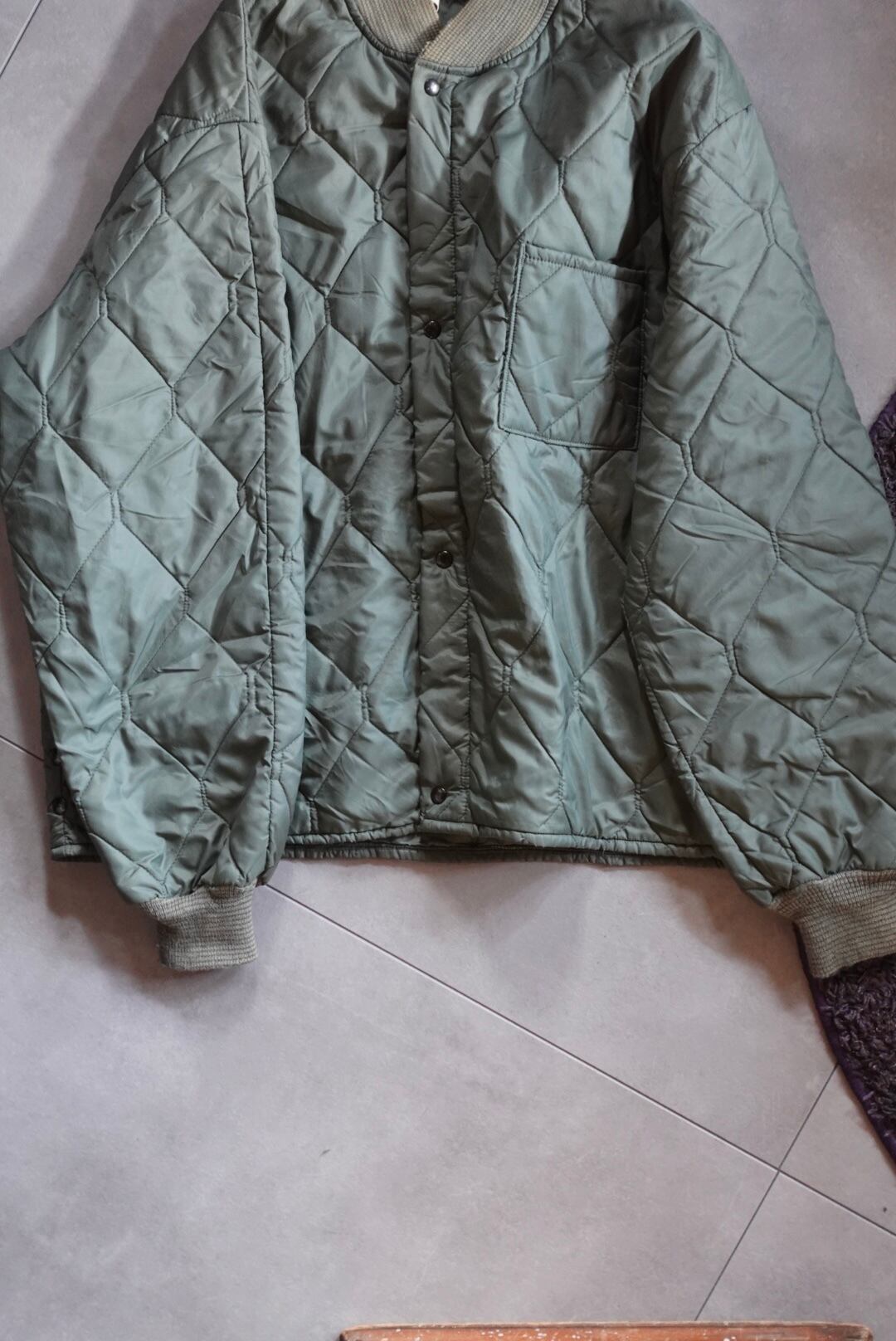 ライナー用のキルティングジャケット。ミリタリーアイテムとしては、可愛らしいカラーリング。春からのアウターとして活躍する事間違いなしの1枚。タグには、使用していた方の名前が書かれた世界に一つだけの特別アイテム